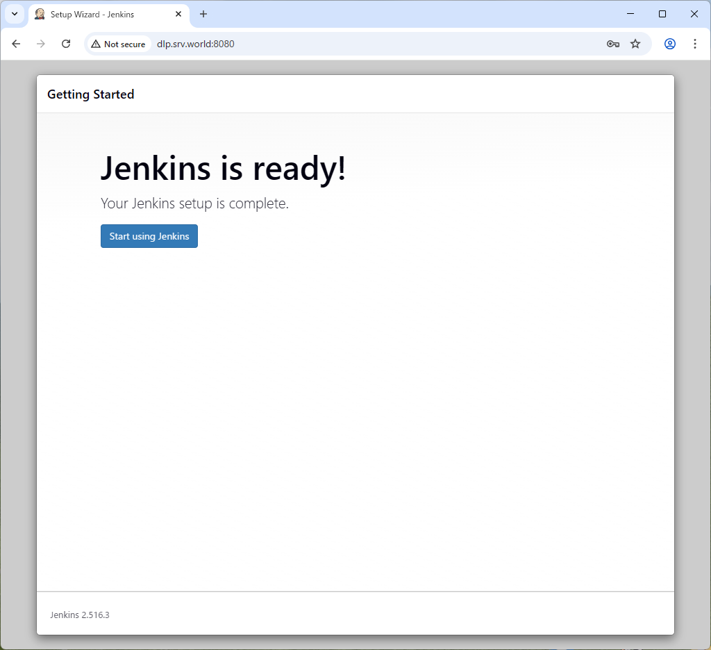 | [8] | 初回セットアップ完了です。[Start using Jenkins] をクリックしてメインページに移動します。 |