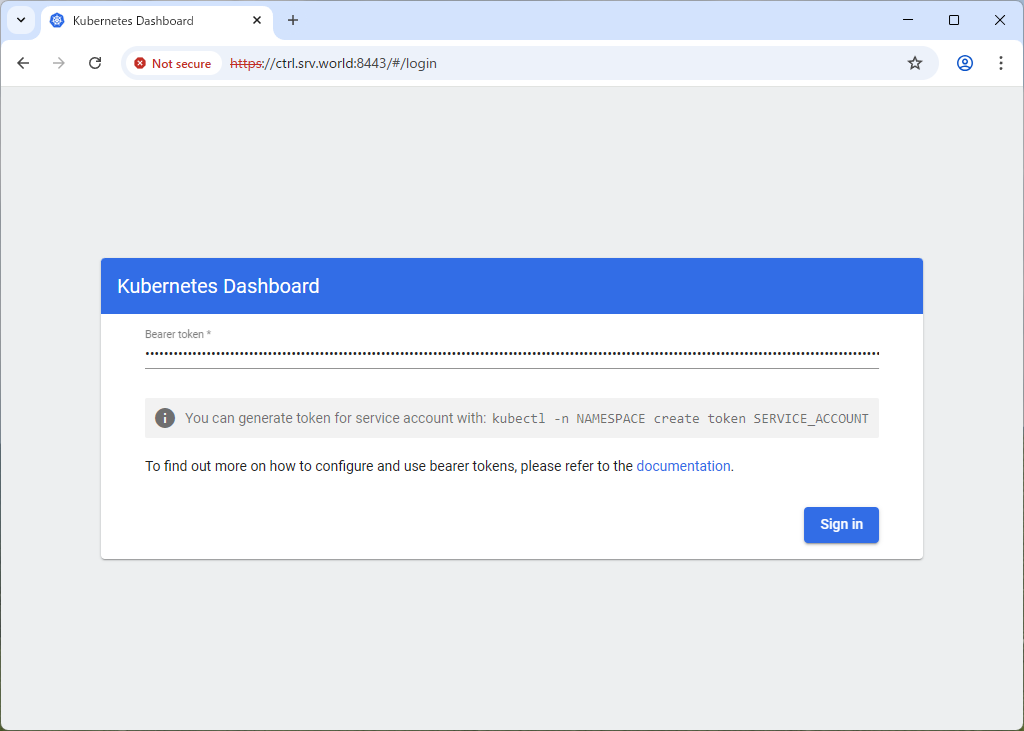 ローカルネットワーク内の任意のコンピューターで Web ブラウザーを起動して、以下の URL にアクセスします。 ⇒ https://(Control Plane ノードのホスト名 または IP アドレス):(設定したポート)/ アクセス後、以下のような画面が表示されたら、[2] で取得したセキュリティトークンを コピー & ペーストして [Sing In] ボタンをクリックします。 |