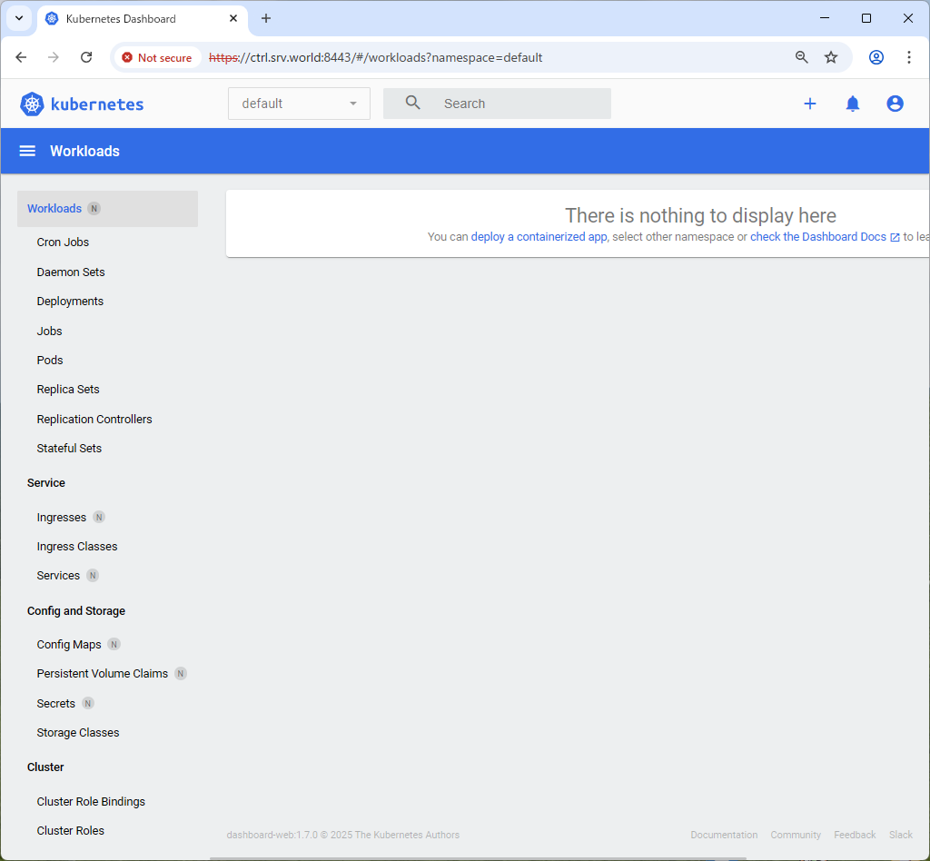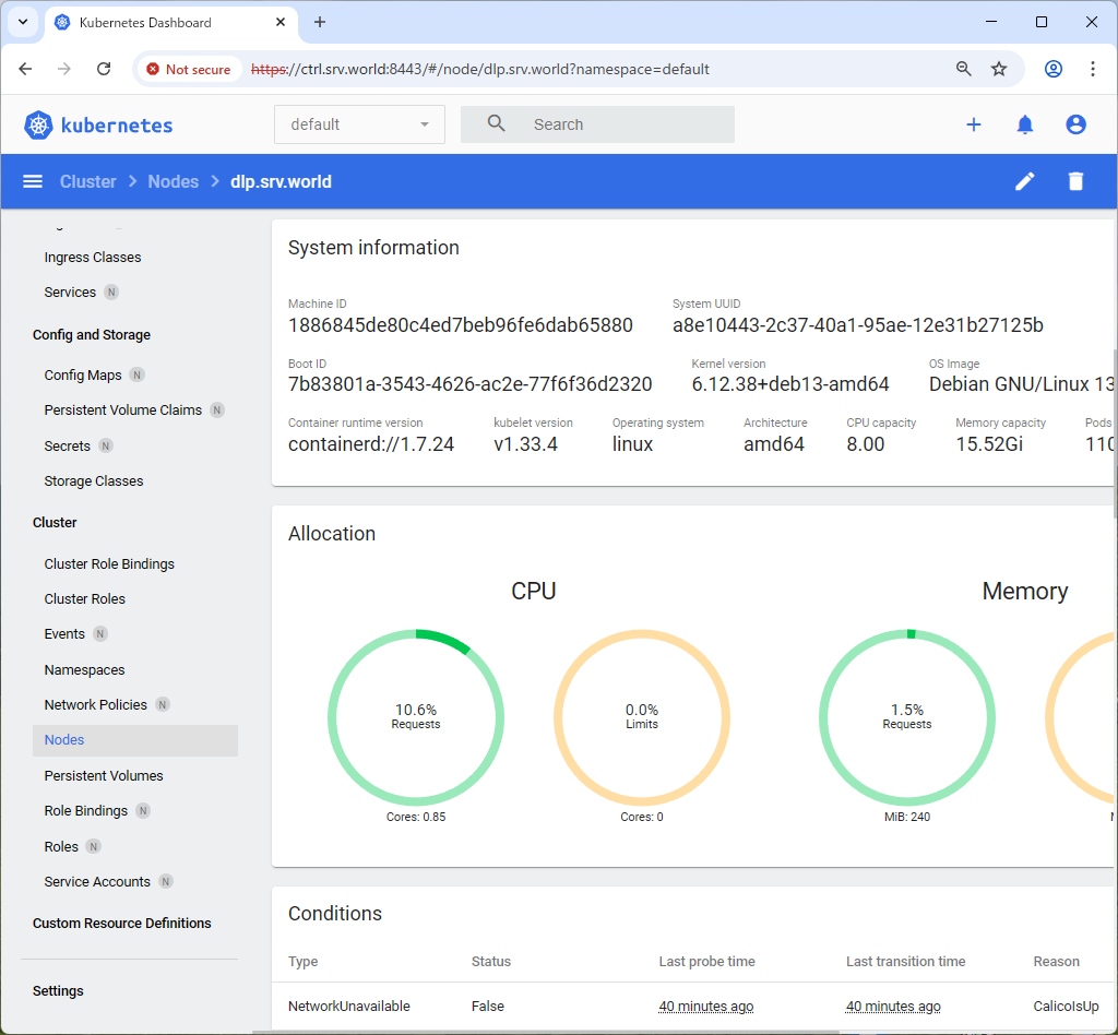 kubectl apply -f rbac.yml clusterrolebinding.rbac.authorization.k8s.io/dashboard-admin created # 追加したアカウントのセキュリティトークン取得 debian@ctrl:~$ kubectl -n kubernetes-dashboard create token dashboard-admin eyJhbGciOiJSUzI1NiIsI..... # ダッシュボードアクセス用にポートフォワードをセット debian@ctrl:~$ kubectl port-forward -n kubernetes-dashboard svc/kubernetes-dashboard-kong-proxy --address 0.0.0.0 8443:443 Forwarding from 0.0.0.0:8443 -> 8443 |