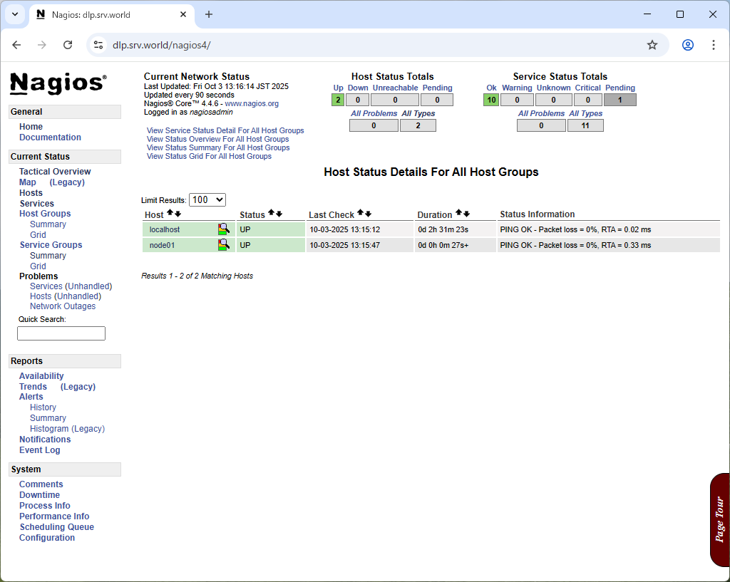 | [2] | 追加設定した監視対象ホストは Nagios 管理サイトにログインすると確認できます。 |