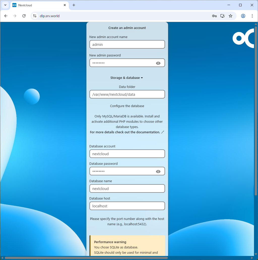 root@dlp:~# mysql Welcome to the MariaDB monitor. Commands end with ; or \g. Your MariaDB connection id is 32 Server version: 11.8.3-MariaDB-0+deb13u1 from Debian -- Please help get to 10k stars at https://github.com/MariaDB/Server Copyright (c) 2000, 2018, Oracle, MariaDB Corporation Ab and others. Type 'help;' or '\h' for help. Type '\c' to clear the current input statement. MariaDB [(none)]> create database nextcloud; Query OK, 1 row affected (0.00 sec) MariaDB [(none)]> grant all privileges on nextcloud.* to nextcloud@'localhost' identified by 'password'; Query OK, 0 rows affected (0.00 sec) MariaDB [(none)]> exit Bye |