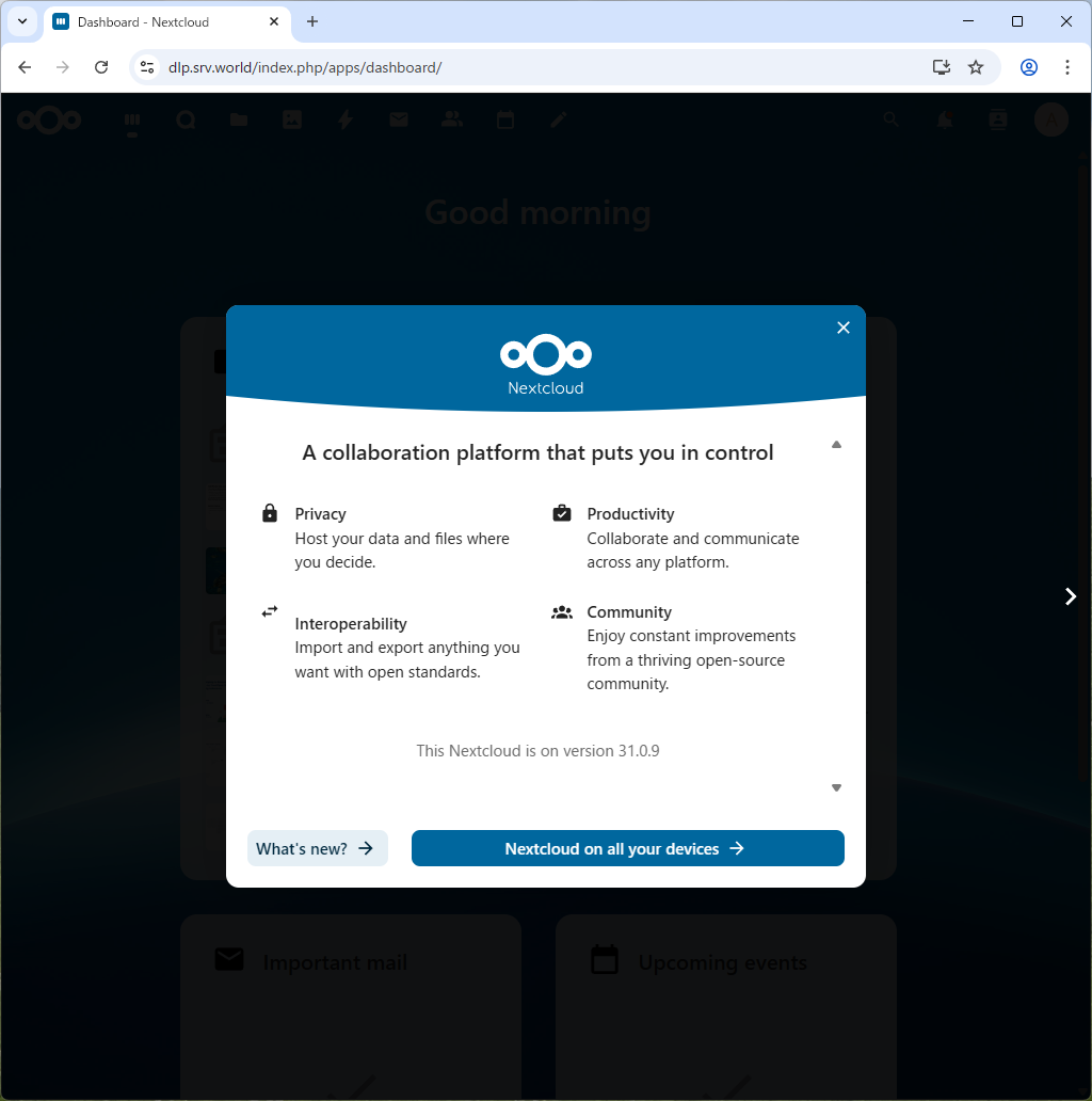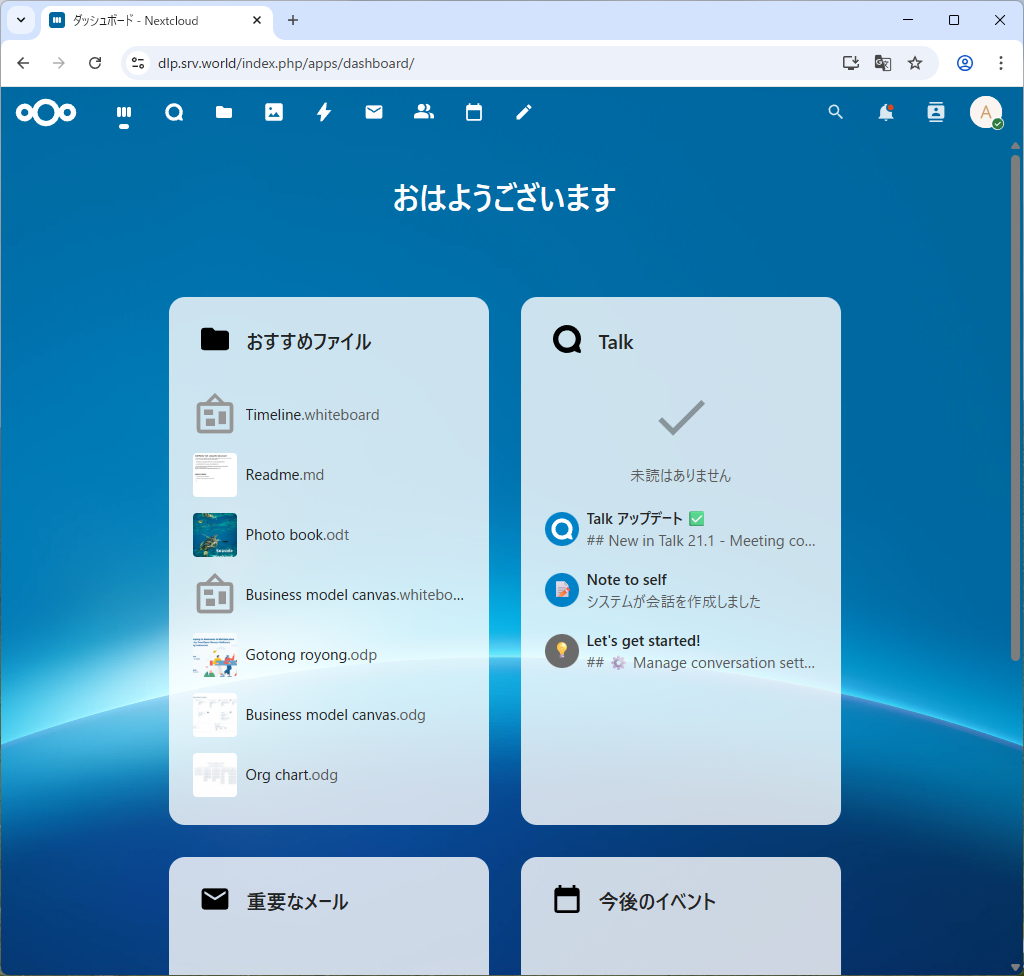 vi /var/www/nextcloud/config/config.php ..... ..... // セクション内の最終行に追記 // [default_phone_region] には自身の国コードを指定 (ISO 3166-1) 'installed' => true, 'memcache.local' => '\OC\Memcache\APCu', 'default_phone_region' => 'JP', 'maintenance_window_start' => 1, 'memcache.locking' => '\OC\Memcache\Redis', 'memcache.distributed' => '\OC\Memcache\Redis', 'redis' => array( 'host' => 'localhost', 'port' => 6379, 'timeout' => 0.0, ), );root@dlp:~# sudo -u www-data php --define apc.enable_cli=1 /var/www/nextcloud/occ db:add-missing-indices Adding additional mail_messages_strucanalyz_idx index to the oc_mail_messages table, this can take some time... oc_mail_messages table updated successfully. Adding additional mail_acc_prov_idx index to the oc_mail_accounts table, this can take some time... oc_mail_accounts table updated successfully. Adding additional mail_alias_accid_idx index to the oc_mail_aliases table, this can take some time... oc_mail_aliases table updated successfully. Adding additional mail_messages_mb_id_uid_uidx index to the oc_mail_messages table, this can take some time... Removing mail_messages_mb_id_uid index from the oc_mail_messages table oc_mail_messages table updated successfully. Adding additional mail_smime_certs_uid_email_idx index to the oc_mail_smime_certificates table, this can take some time... Removing mail_smime_certs_uid_idx index from the oc_mail_smime_certificates table oc_mail_smime_certificates table updated successfully. Adding additional mail_trusted_senders_idx index to the oc_mail_trusted_senders table, this can take some time... Removing mail_trusted_senders_type index from the oc_mail_trusted_senders table oc_mail_trusted_senders table updated successfully. Adding additional mail_coll_idx index to the oc_mail_coll_addresses table, this can take some time... Removing mail_coll_addr_userid_index index from the oc_mail_coll_addresses table Removing mail_coll_addr_email_index index from the oc_mail_coll_addresses table oc_mail_coll_addresses table updated successfully.root@dlp:~# sudo -u www-data php --define apc.enable_cli=1 /var/www/nextcloud/occ maintenance:repair --include-expensive root@dlp:~# systemctl reload apache2 |