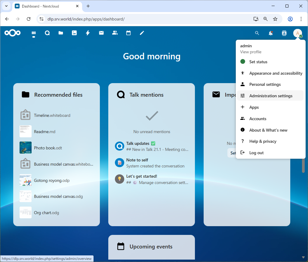 | [15] | NextCloud Talk 用の高性能バックエンドを設定しておきます。 管理ユーザーでログインして [Administration settings] を開きます。 |