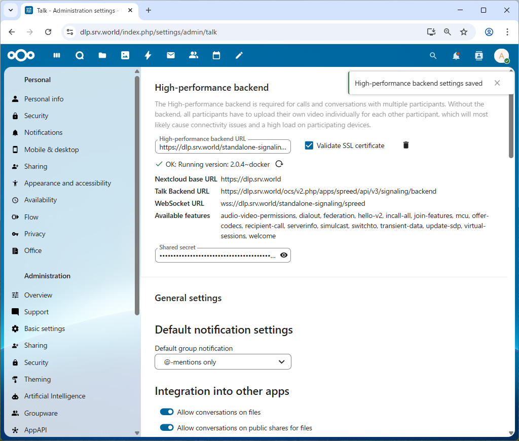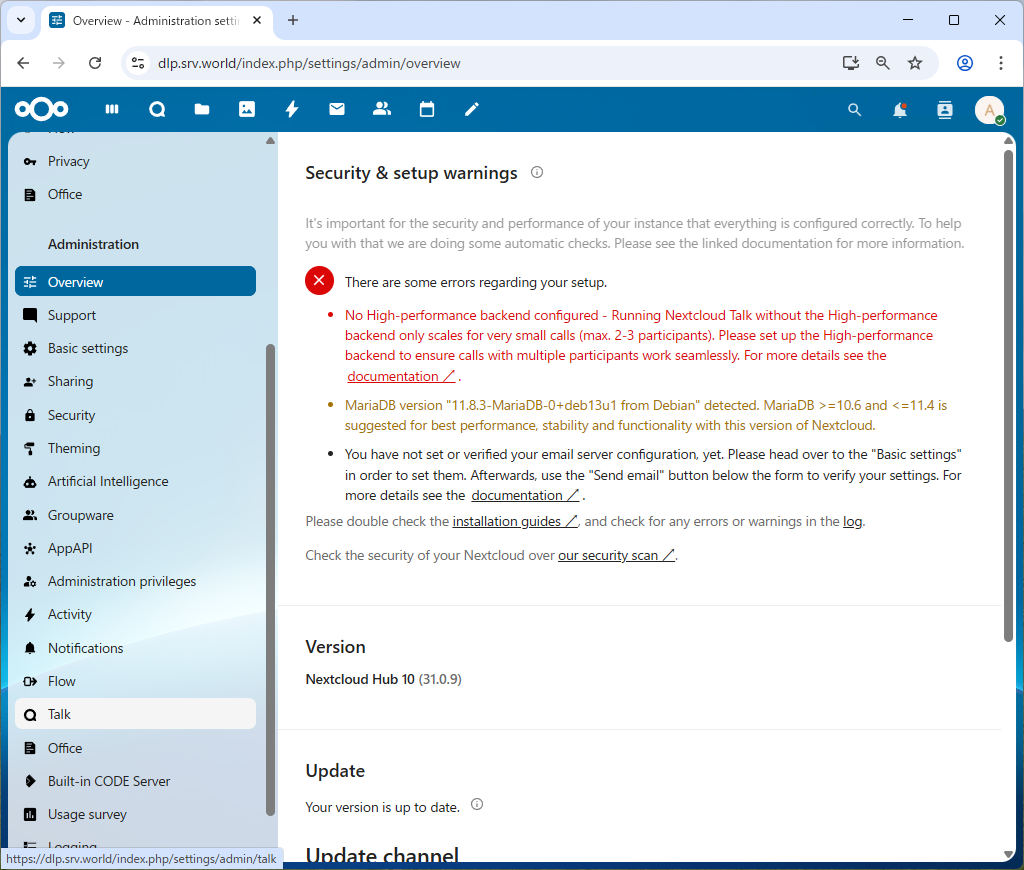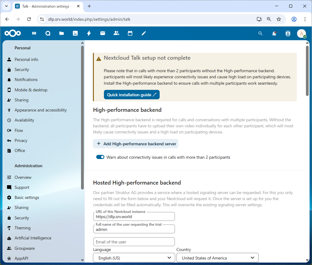 | [7] | NextCloud Talk で高性能バックエンドが使用できるように設定しておきます。 |
