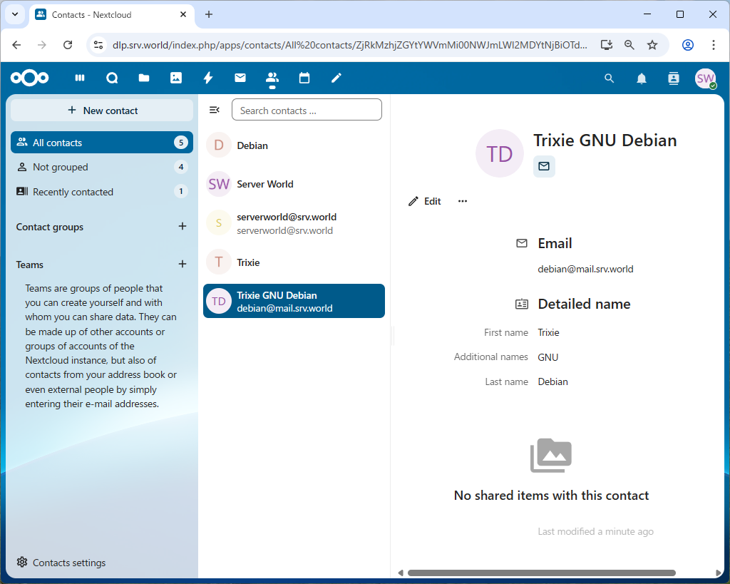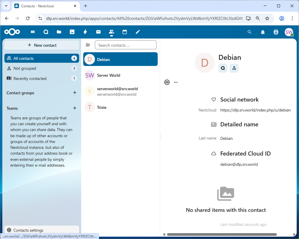 この状態で、クリップボードに自身の連絡先へのアクセス URL がコピーされます。これは後ほどクライントアプリで入力するため、控えておきます。 当例の場合、以下のような URL がコピーされます。 ⇒ https://dlp.srv.world/remote.php/dav/addressbooks/users/serverworld/contacts/ |