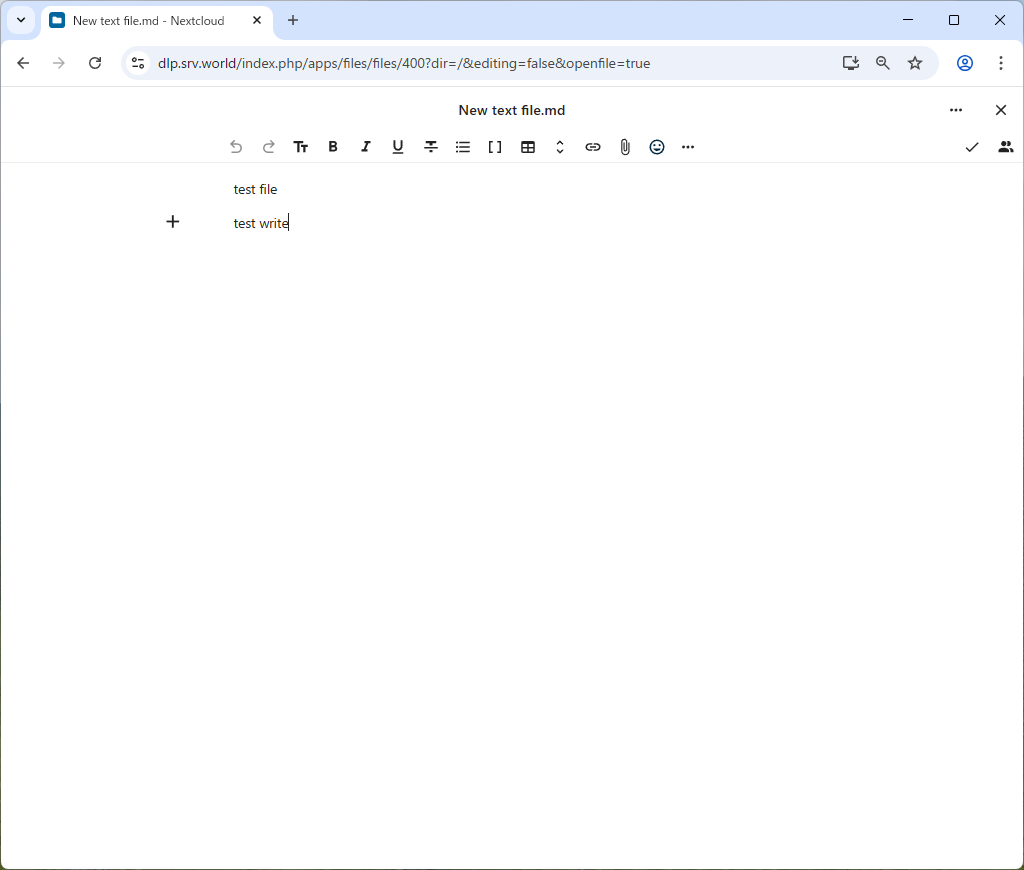 | [5] | テキストドキュメント等はクリックして開くと内容が表示され、そのまま編集可能です。右上の [✓] ボタンをクリックすると編集した内容が保存されます。 |
