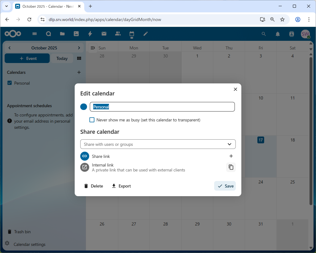 | [1] | 自身の NextCloud ユーザーで NextCloud Web にログインして、画面上部の [カレンダー] アイコンをクリックします。 次に、左メニューの自身のカレンダー名 (デフォルトは [個人]) の右の ペン アイコンをクリックして、[インターナルリンク] の項目から [プライベートリンクをコピー] を選択します。 この状態で、クリップボードに自身のカレンダーへのアクセス URL がコピーされます。これは後ほどクライントアプリで入力するため、控えておきます。 当例の場合、以下のような URL がコピーされます。 ⇒ https://dlp.srv.world/remote.php/dav/calendars/serverworld/personal/ |