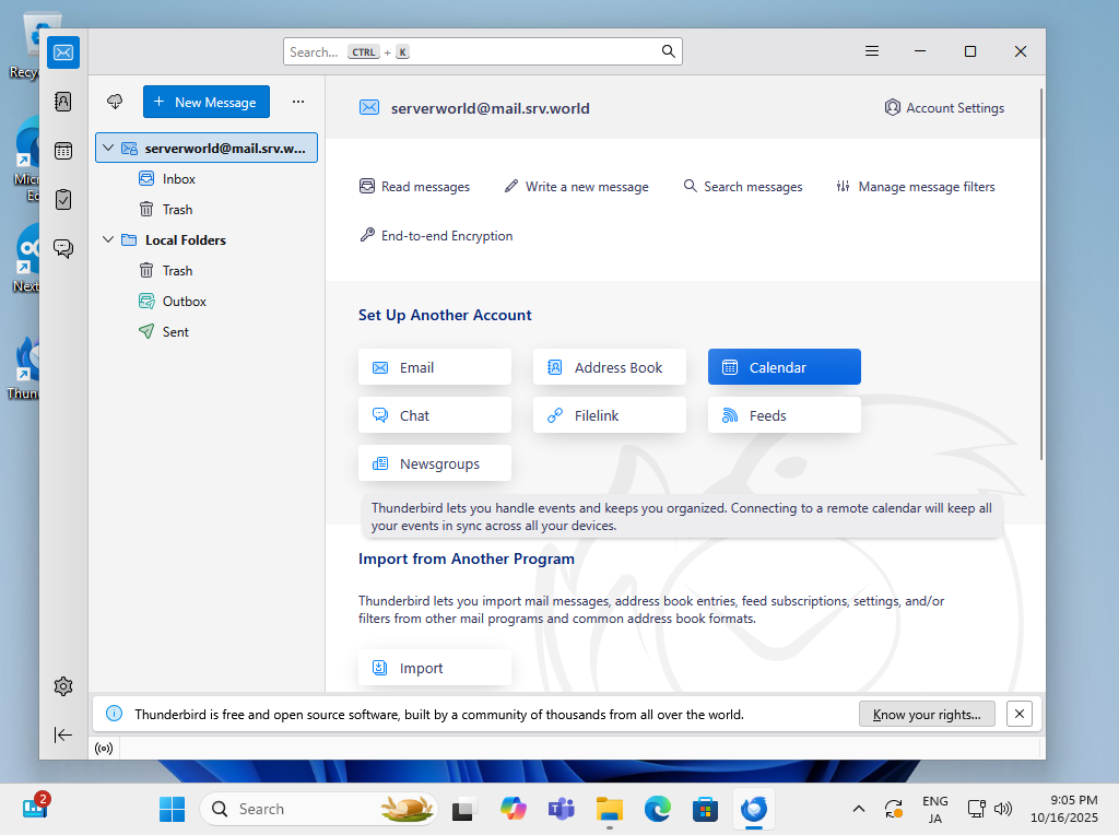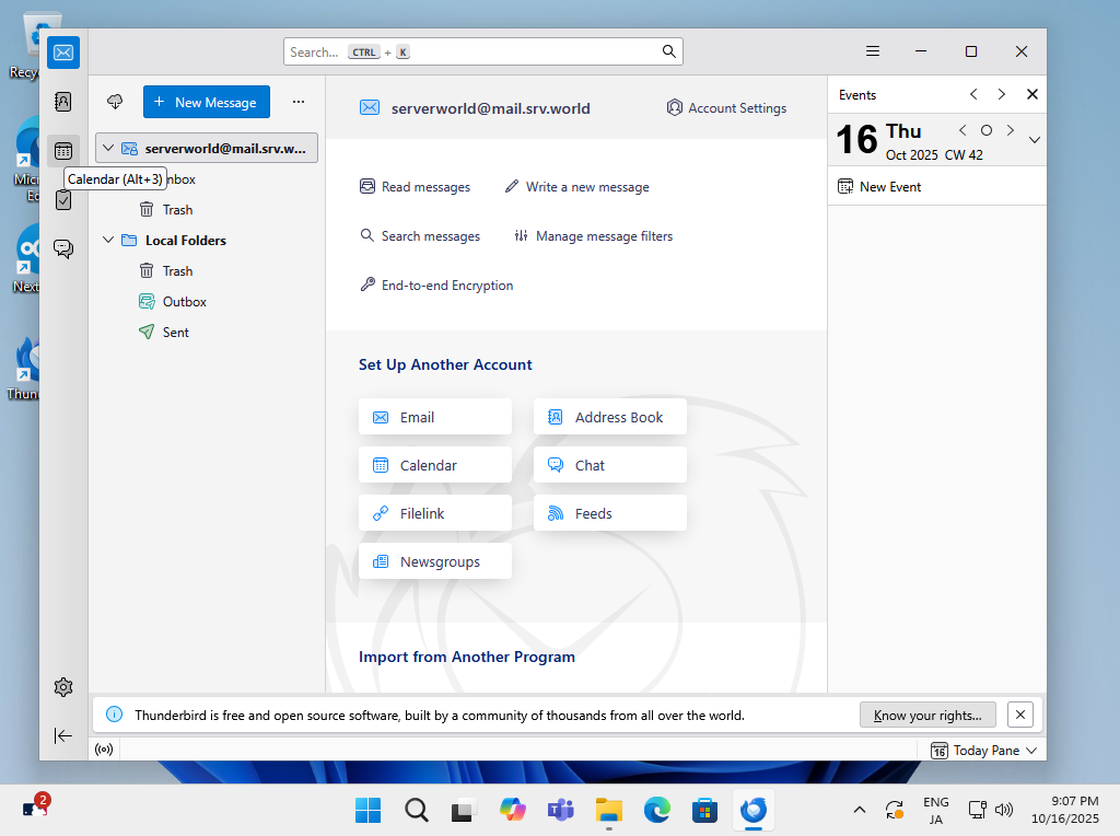 | [2] | クライアントコンピューターの設定です。Windows 11 にインストールした Thunderbird を例にします。 Thunderbird 起動後のデフォルト画面で [カレンダー] アイコンをクリックしてセットアップウイザードを起動します。 |