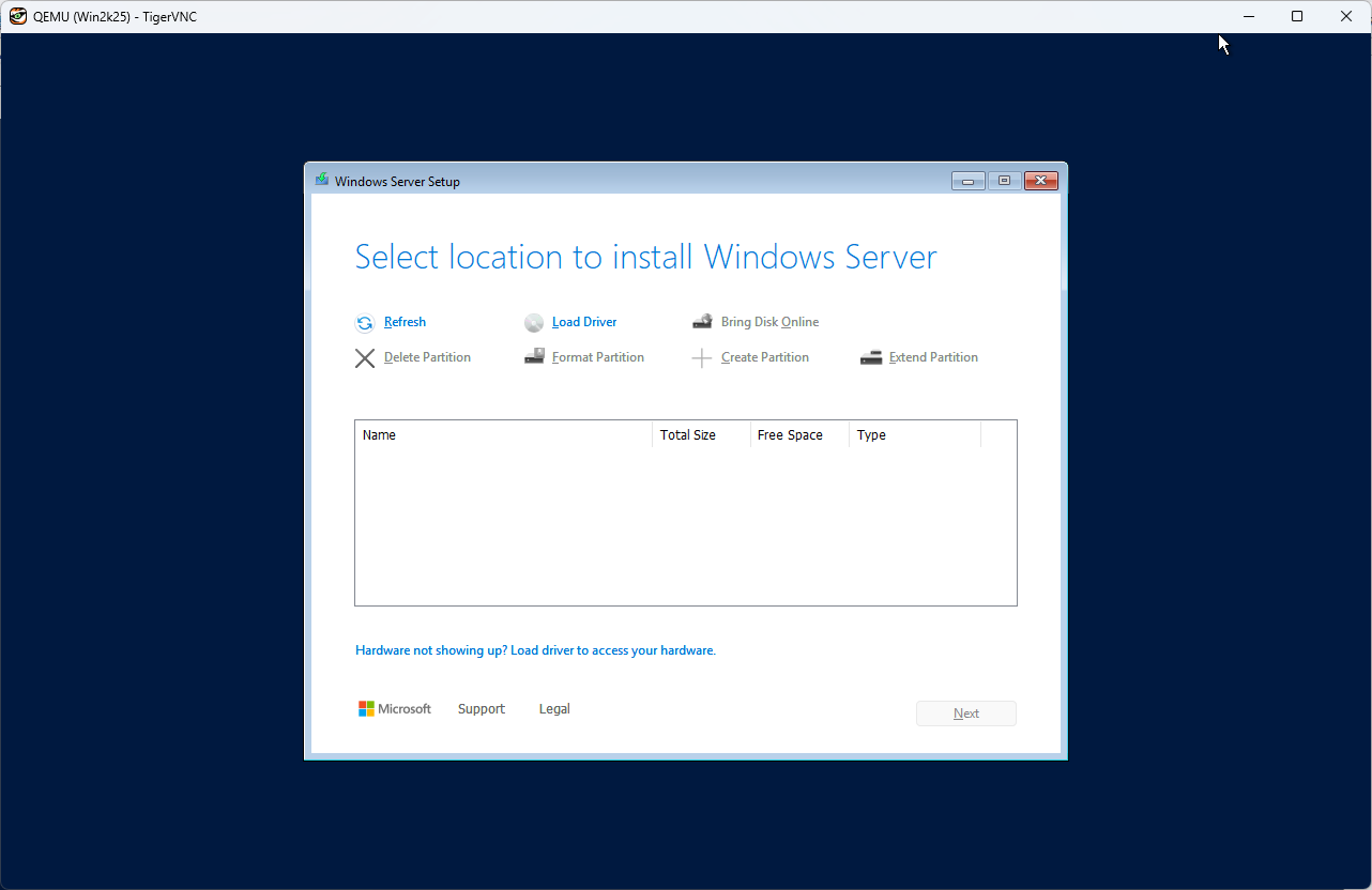 | [1] | 任意の Compute ノードで Windows のイメージを作成して、Glance へ登録します。 例として、Windows Server 2025 のイメージを作成します。 Windows Server 2025 インストール ISO イメージは事前にダウンロードしておきます。 |