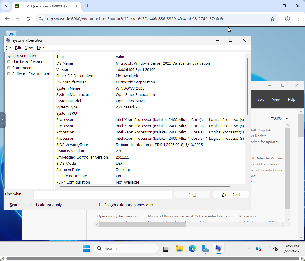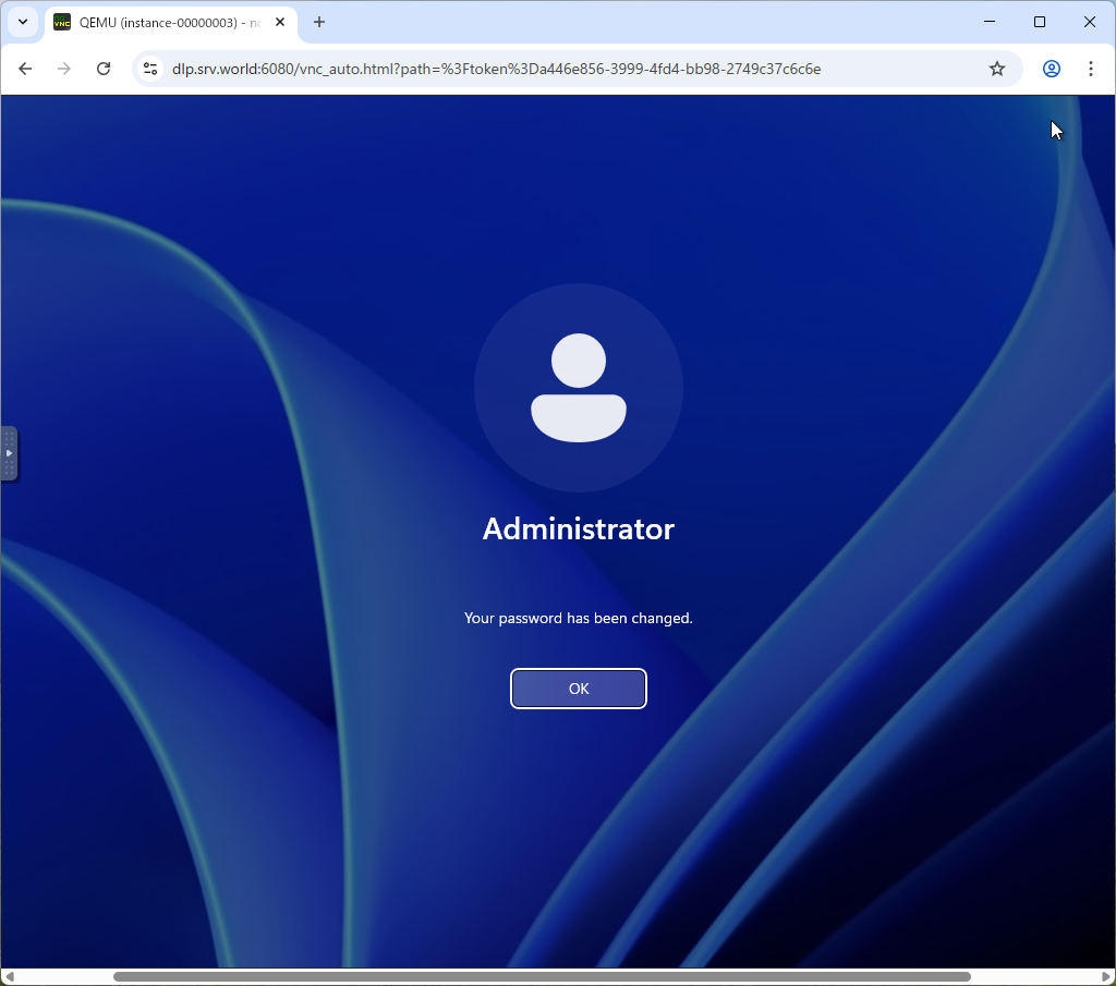 openstack server list +--------------------------------------+--------------+---------+-----------------------+----------+-----------+ | ID | Name | Status | Networks | Image | Flavor | +--------------------------------------+--------------+---------+-----------------------+----------+-----------+ | d73ebaa5-c4dc-43ce-b330-ea64758c5526 | Windows-2025 | ACTIVE | sharednet1=10.0.0.221 | Win2k25 | m3.medium | | 5eaa74ea-6fc6-4c24-b758-37eaad533c88 | Debian-13 | SHUTOFF | sharednet1=10.0.0.247 | Debian13 | m1.small | +--------------------------------------+--------------+---------+-----------------------+----------+-----------+debian@dlp ~(keystone)$ openstack console url show Windows-2025 +----------+-----------------------------------------------------------------------------------------------+ | Field | Value | +----------+-----------------------------------------------------------------------------------------------+ | protocol | vnc | | type | novnc | | url | https://dlp.srv.world:6080/vnc_auto.html?path=%3Ftoken%3Da446e856-3999-4fd4-bb98-2749c37c6c6e | +----------+-----------------------------------------------------------------------------------------------+ |