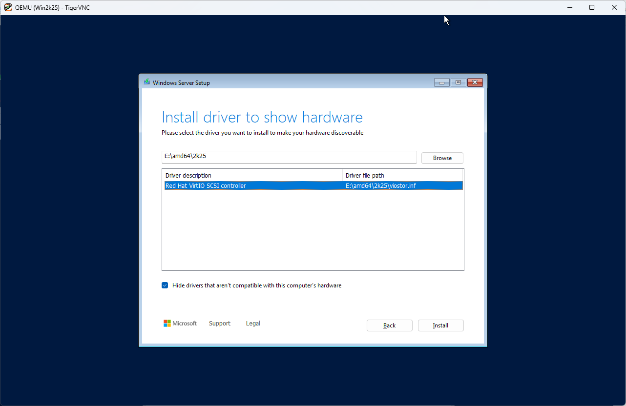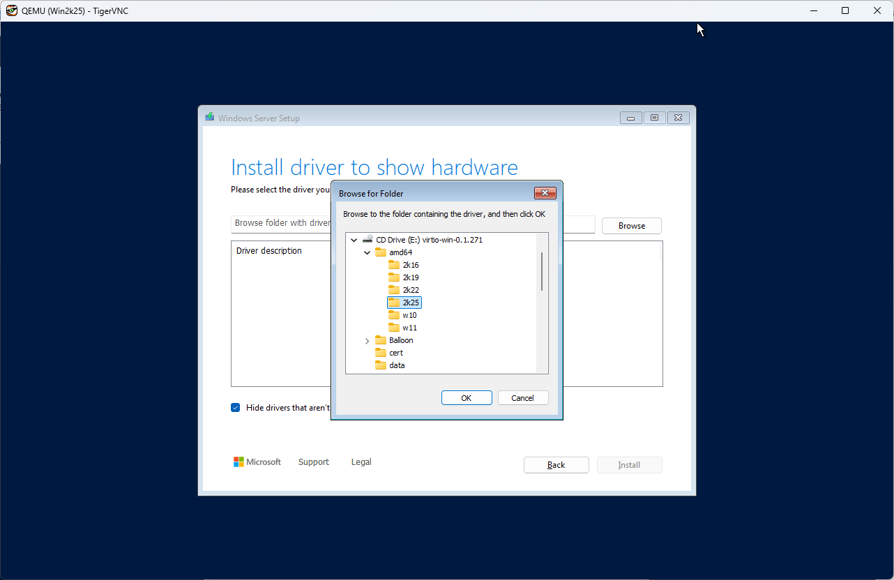| [3] | [virtio-win.iso] 配下のフォルダーを指定します。 x64 システムの場合、[amd64] - [2k25] を選択して次へ進めば、適切なドライバーが選択されます。 この後は通常のインストールと同じです。 |