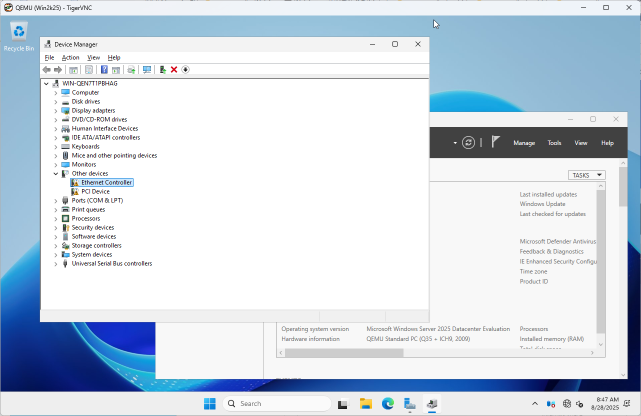 | [4] | インストール後、システムにログオンし、ネットワーク デバイス にも VirtIO ドライバーを適用しておきます。 その他、必要に応じて、ディスプレイや PCI デバイスにも VirtIO ドライバーを適用します。 また、後ほど Sysprep が実行されるため、Windows アップデートがあれば適用しておきます。 |