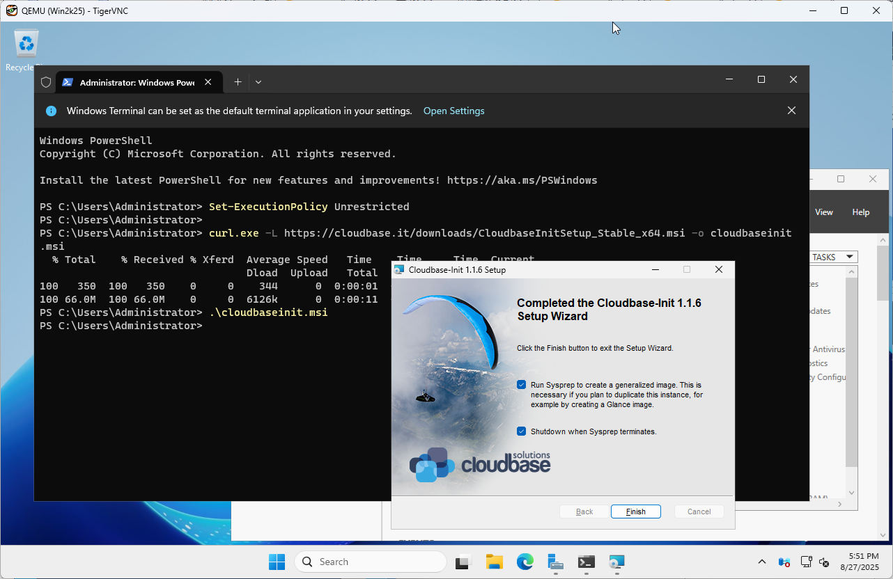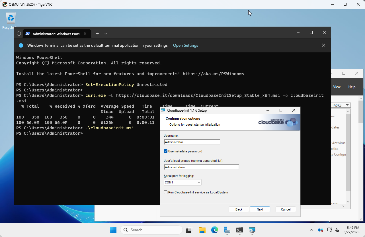 | [6] | CloudbaseInit をダウンロードしてインストールします。 PS > curl.exe -L https://cloudbase.it/downloads/CloudbaseInitSetup_Stable_x64.msi -o cloudbaseinit.msi PS > ./cloudbaseinit.msi |