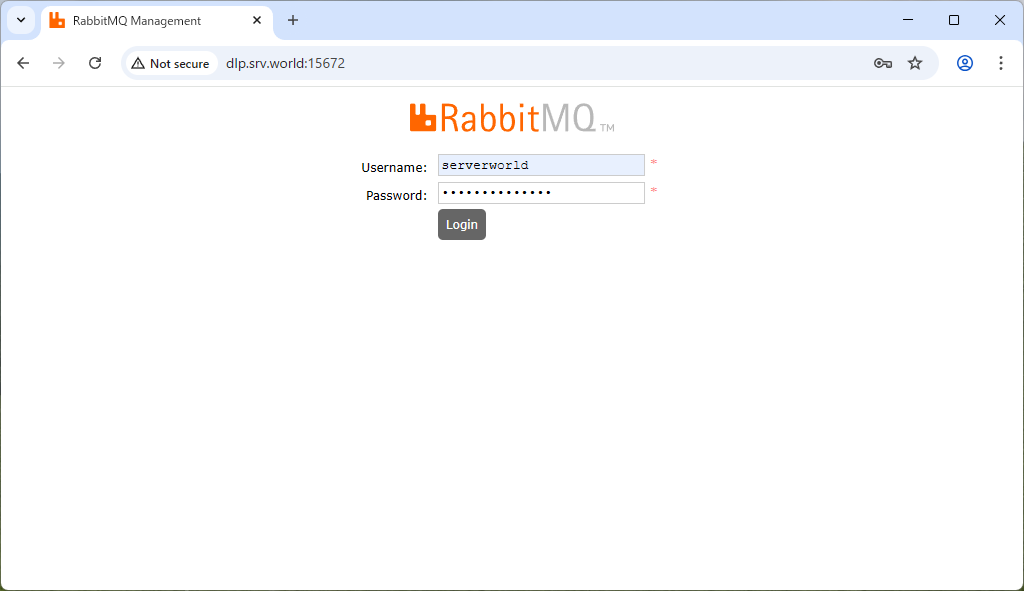| [2] | 任意のクライアントコンピューターで Web ブラウザーを起動し、[(サーバーのホスト名 または IP アドレス):15672/] にアクセスします。 すると、認証フォームが表示されるので、RabbitMQ に登録したユーザー (且つ 管理者ロールが付与されたユーザー) で認証してログインします。 |