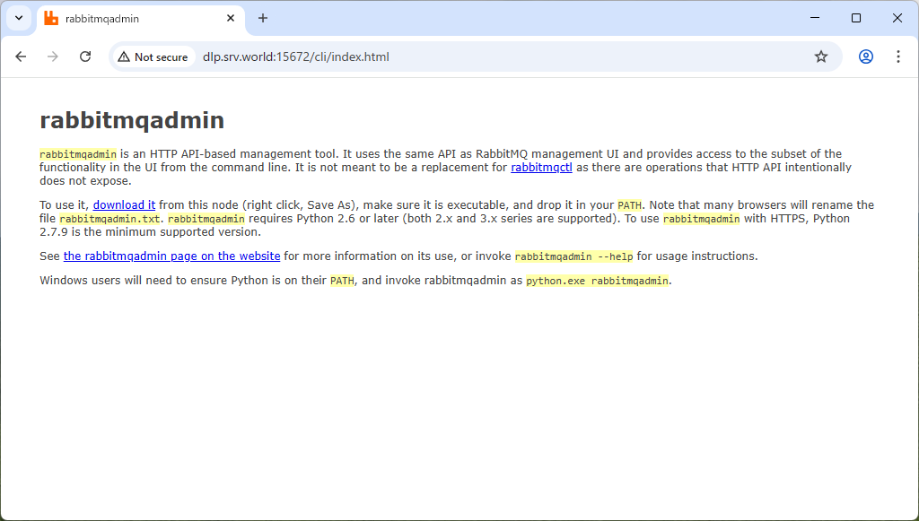 | [1] | [rabbitmqadmin] コマンドは Web UI からダウンロード可能です。 Web UI にログインし、[(サーバーのホスト名 または IP アドレス):15672/cli] にアクセスして画面の指示に従ってダウンロードします。 |