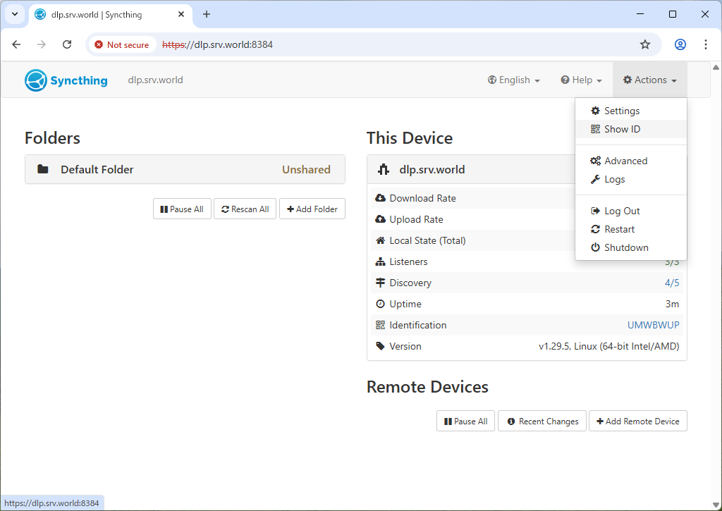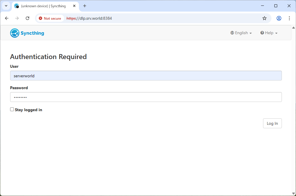 [3] | 任意のクライアントコンピューターから、いずれかの Syncthing ホストの設定したアドレスへアクセスして、設定した管理ユーザーでログインします。 |