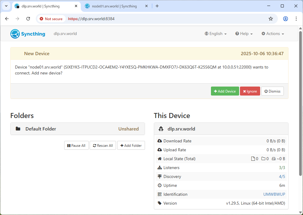 Syncthing によるファイル同期の設定です。 当例では [dlp.srv.world] と [node01.srv.world] 間で、任意のディレクトリ配下を同期するよう設定します。+----------------------+ | +----------------------+ | dlp.srv.world |10.0.0.30 | 10.0.0.51| node01.srv.world | | +----------+----------+ | | | <-------------> | | +----------------------+ sync +----------------------+ |