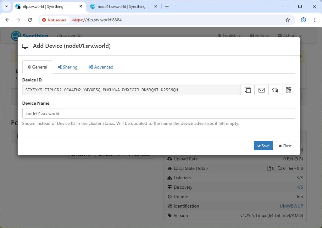 [7] | [Device ID] のフィールドに、他ホストで表示された 接続用 ID を入力し、[Device Name] には同期するホストの名称 (任意の名称) を入力して [Save] ボタンをクリックします。 |