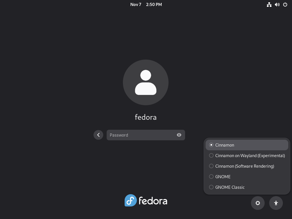 | [2] | システムをグラフィカルログインに変更して使用する場合は、こちらを参考に、設定を変更してシステムを再起動します。 再起動後、ログイン画面で [Sign In] ボタンの左横のアイコンをクリックし、[Cinnamon] を選択してログインします。 |