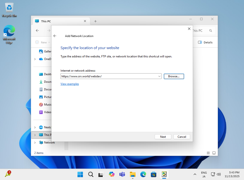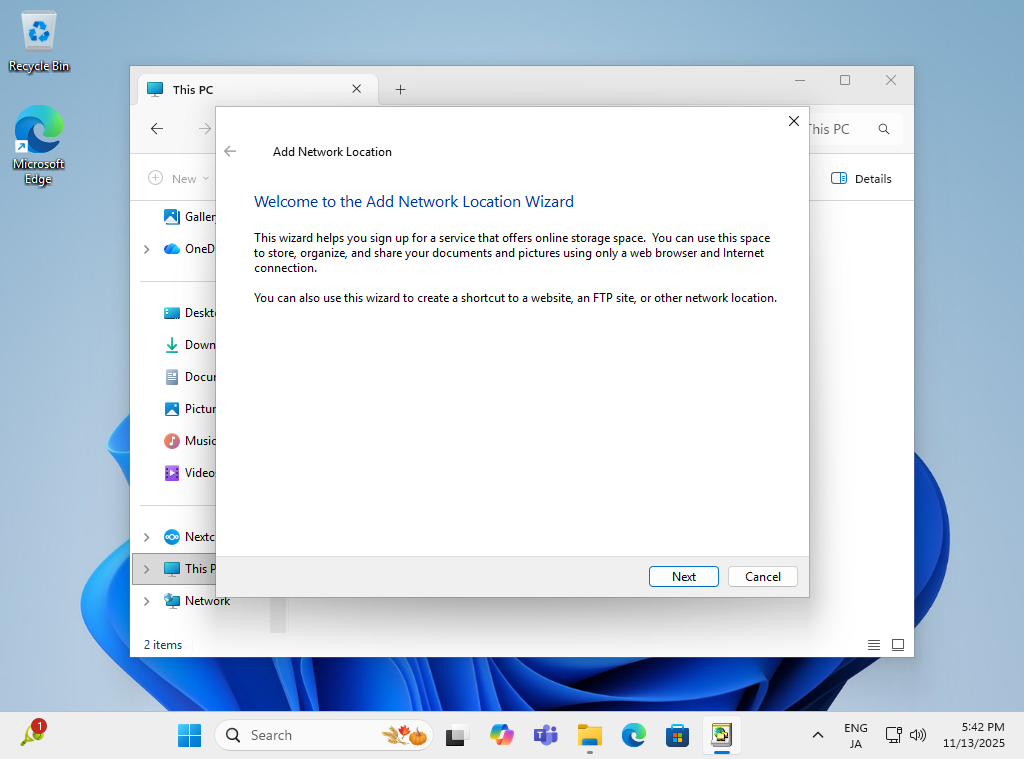 WebDAV クライアントの設定です。Windows 11 を例にします。 [PC] を開き、上部メニューから [ネットワークの場所の追加] アイコンをクリックします。 |