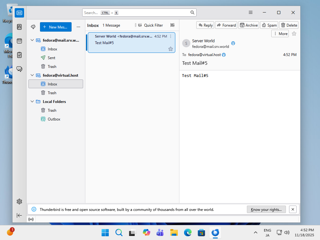 | [2] | 追加アカウントをメールクライアントへ設定し、送受信テストを実行して、正常に送受信できれば OK です。 |