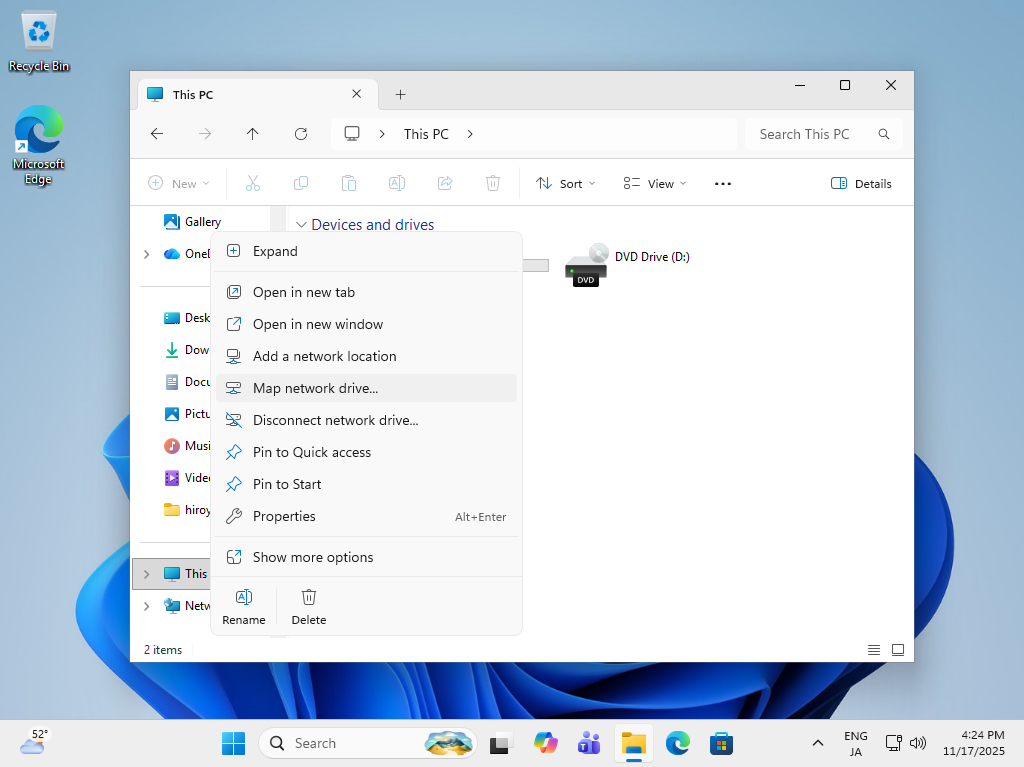 | [2] | ファイルエクスプローラーを開き、右メニューの [ネットワーク] を右クリックして、[その他のオプションを表示] - [ネットワークドライブの割り当て] を選択します。 |
