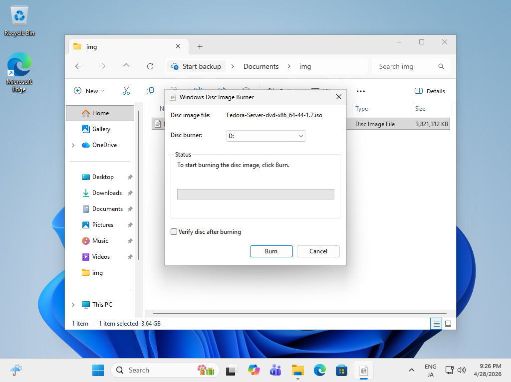 Fedora 44 インストール メディア 作成 (DVD) |