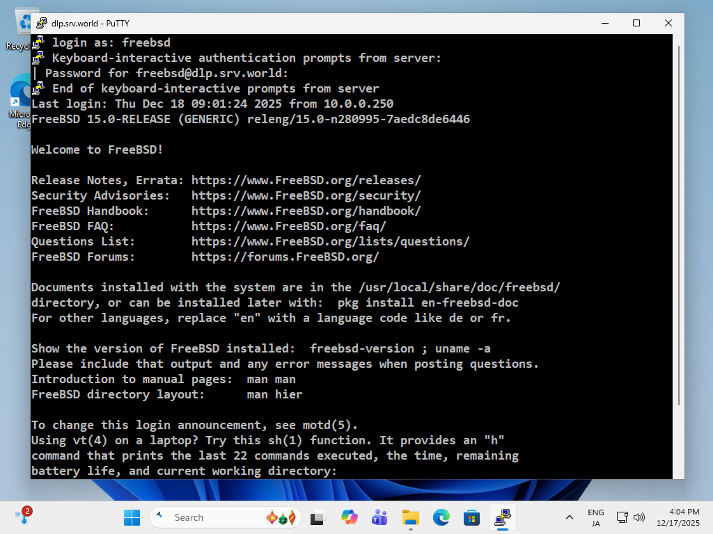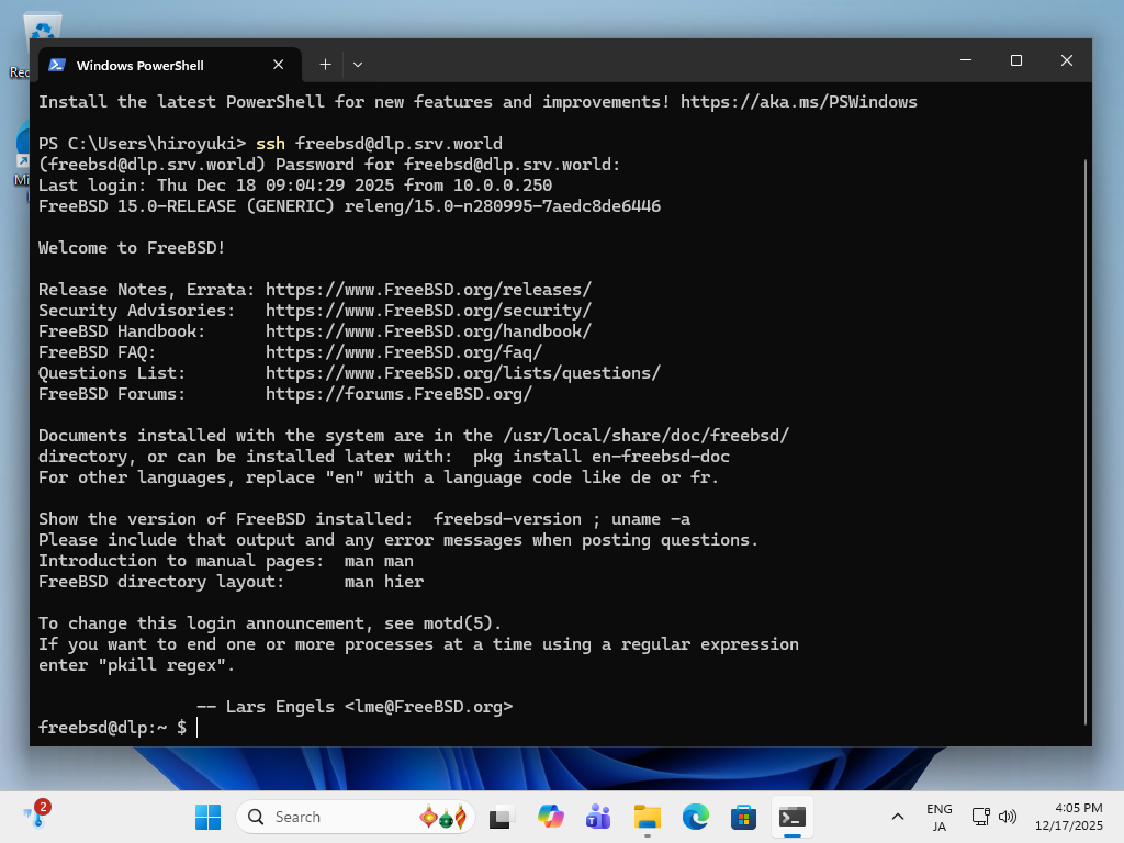 freebsd@dlp:~ $ # ログインできた |