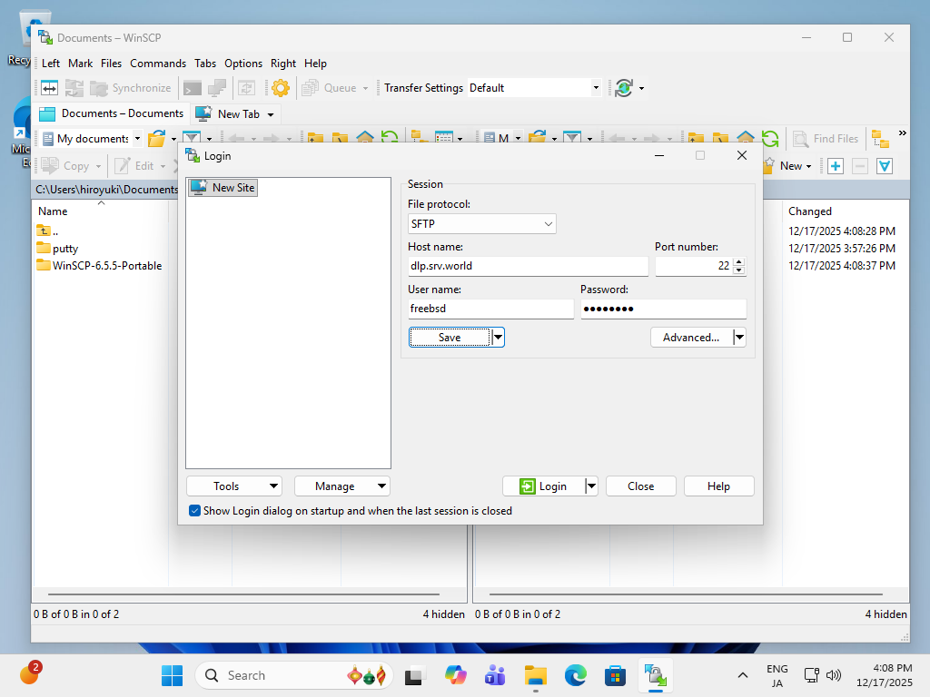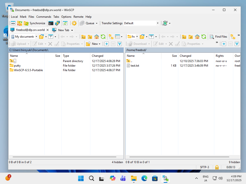 Windows クライアントからも SSH サーバーに対して、暗号化通信によるセキュアなファイル転送をすることができます。 なお、こちらのリンク先 [6] に記載の通り、Windows には OpenSSH クライアントが標準搭載されているため、WinSCP 等のクライアントソフトウェアを用意しなくとも、[scp], [sftp] コマンドでのファイル転送も可能です。 |