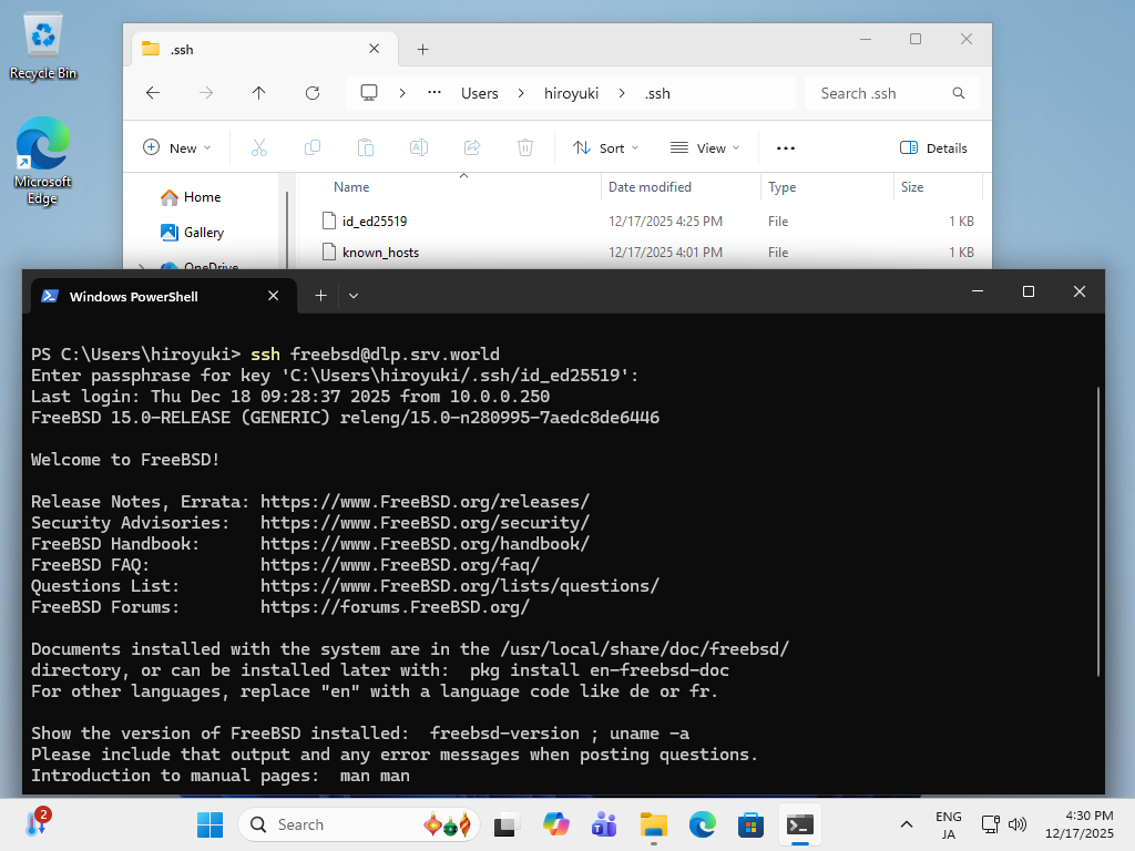 # サーバーで作成した秘密鍵を SCP で持ってくる freebsd@node01:~ $ scp freebsd@dlp.srv.world:/home/freebsd/.ssh/id_ed25519 ~/.ssh/ (freebsd@dlp.srv.world) Password for freebsd@dlp.srv.world: id_rsa 100% 2655 2.8MB/s 00:00freebsd@node01:~ $ ssh freebsd@dlp.srv.world Enter passphrase for key '/home/freebsd/.ssh/id_ed25519': # 設定したパスフレーズ Last login: Thu Dec 18 09:22:22 2025 from node01.srv.world FreeBSD 15.0-RELEASE (GENERIC) releng/15.0-n280995-7aedc8de6446 Welcome to FreeBSD! ..... ..... freebsd@dlp:~ $ # ログインできた |