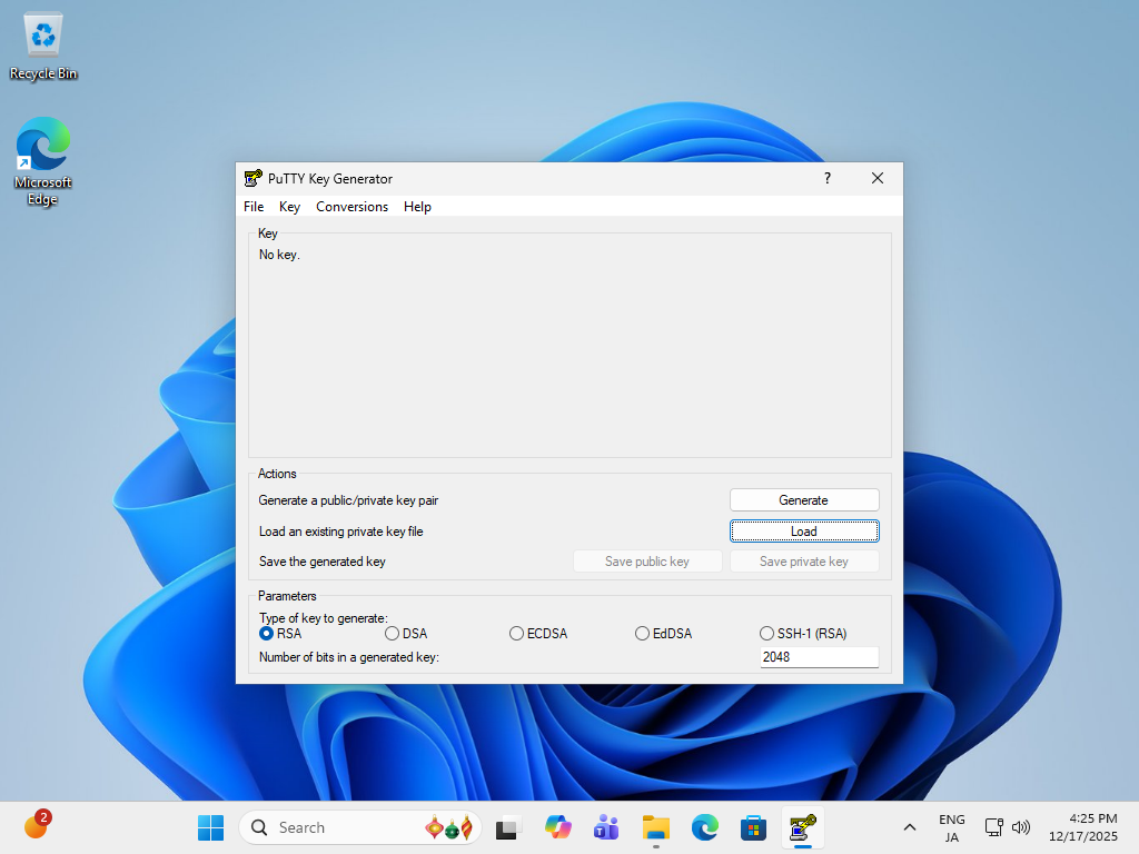 | [4] | Puttyの公式サイト より [Puttygen.exe] をダウンロードして [Putty.exe] と同じフォルダに保管して実行します。以下の画面が表示されたら [Load] ボタンをクリックします。 |