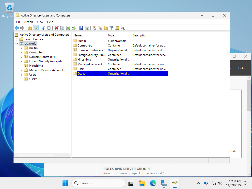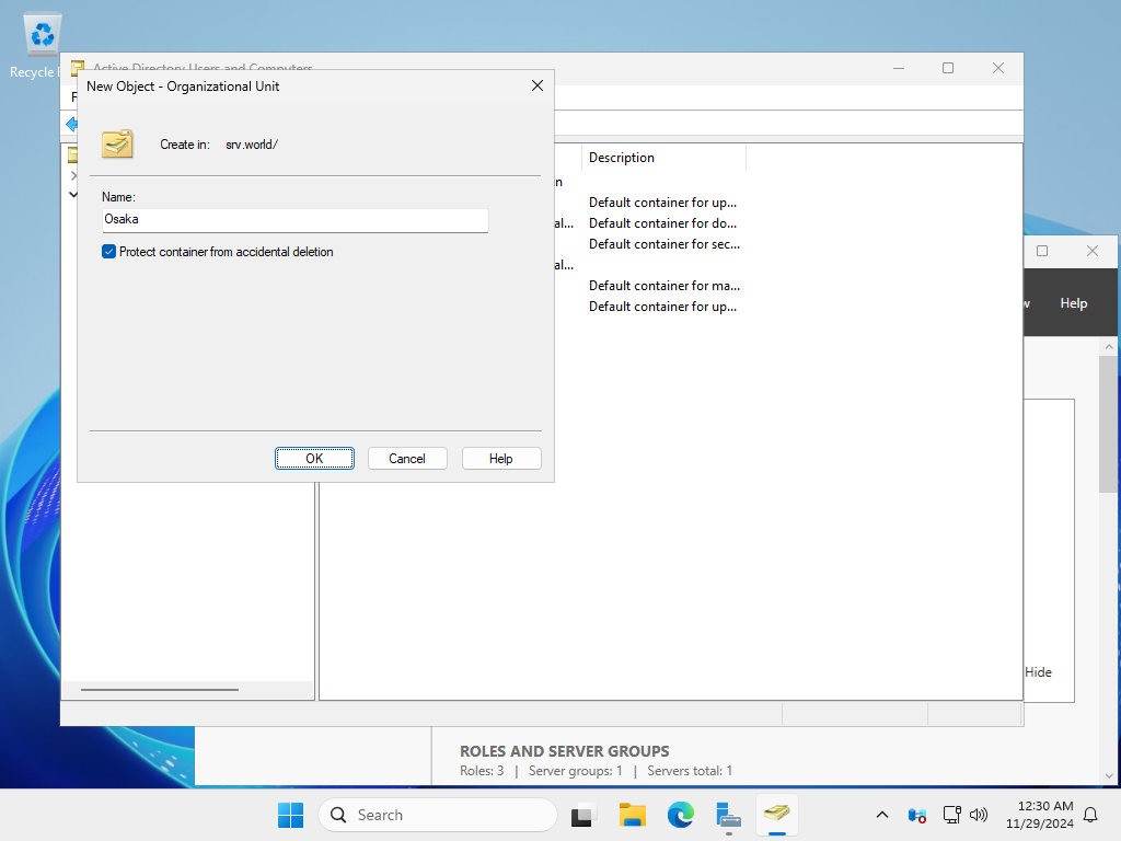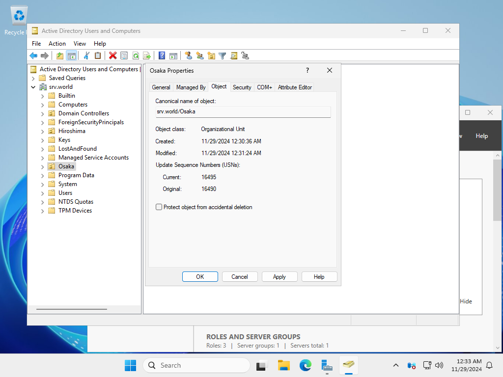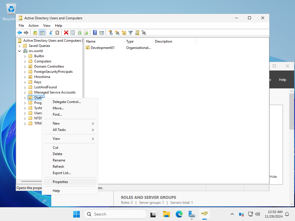 PS C:\Users\Administrator> Remove-ADOrganizationalUnit -Identity "OU=Development01,OU=Hiroshima,DC=srv,DC=world"
