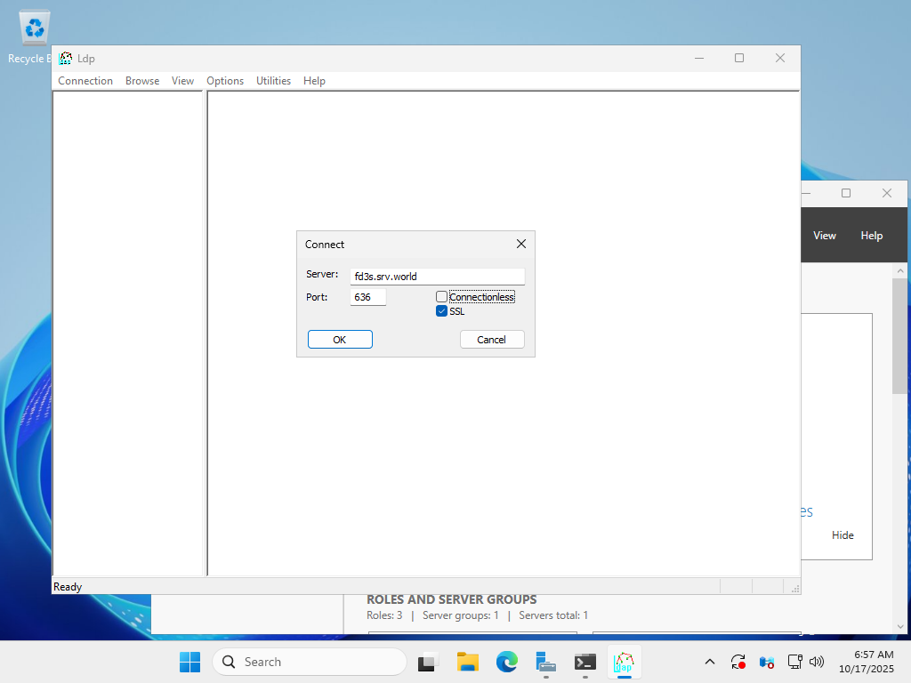 | [4] | 再起動後、PowerShell 等から [ldp.exe] を起動し、[connection] - [connect] を開くと以下の画面になります。 ここで、[Server] の項目には AD ホストを FQDN で入力、[Port] には [636] を指定、[SSL] にチェックを入れて、[OK] します。 |