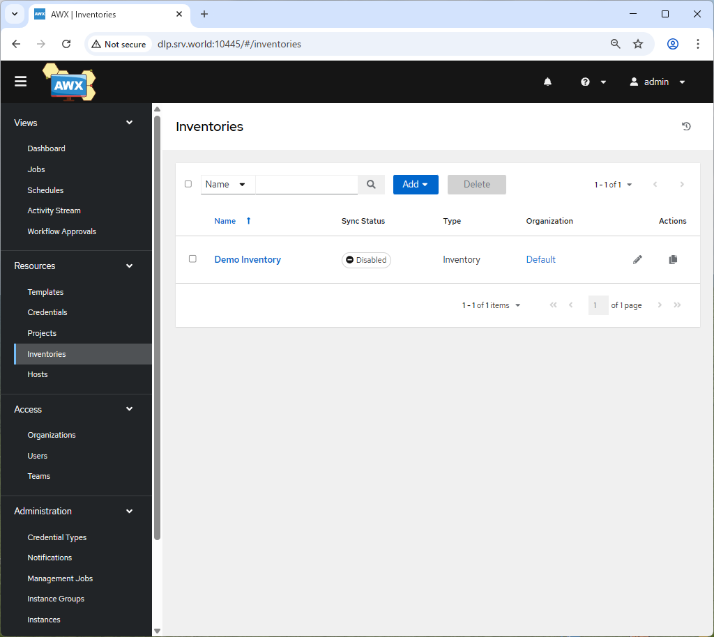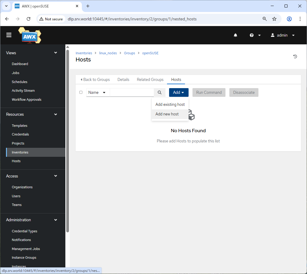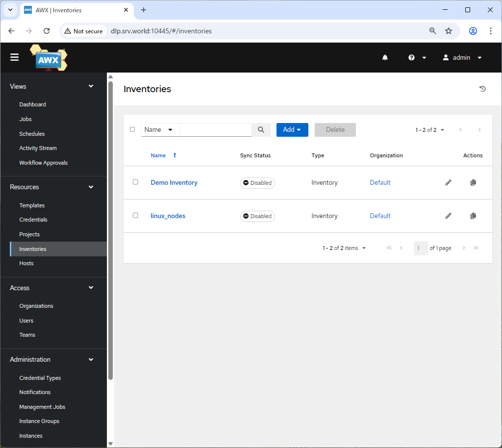 | [1] | Ansible AWX の Web コンソールにログインし、左ペインで [Inventories] をクリックします。 |
