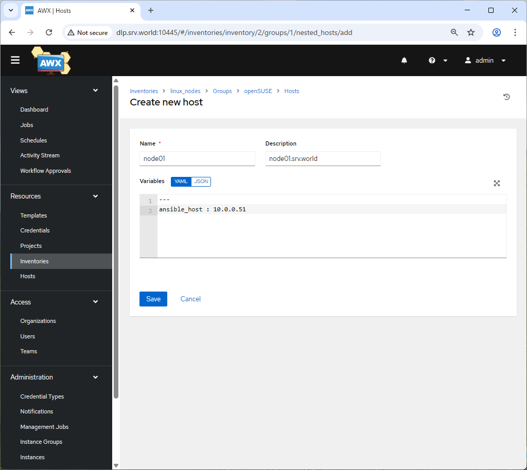 | [9] | 管理したいホストの基本情報を入力して [Save] ボタンをクリックし、保存します。 [Name] には任意の名称を、[Description] は入力必須ではないが、必要であれば概要を、 [Variables] には、以下のように、[ansible_host : '管理したいサーバーのホスト名 または IP アドレス'] と入力します。 |