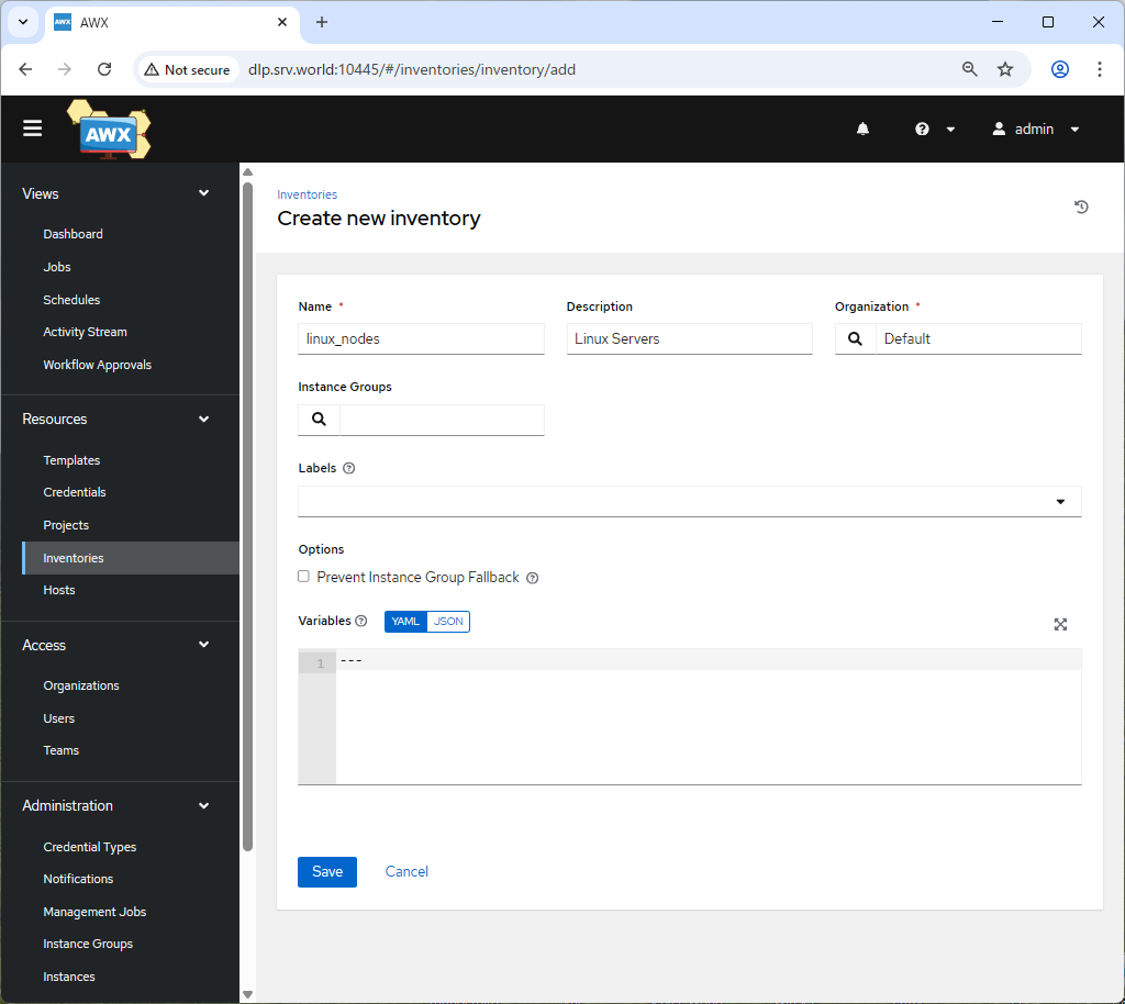 | [3] | インベントリーの基本情報を入力して [Save] ボタンをクリックし、保存します。 入力必須なのは [Name] と [Organization] の項目のみです。 [Name] には任意の名称を設定すれば OK、[Organization] は特別な要件がなければデフォルトのままでも OK です。 |