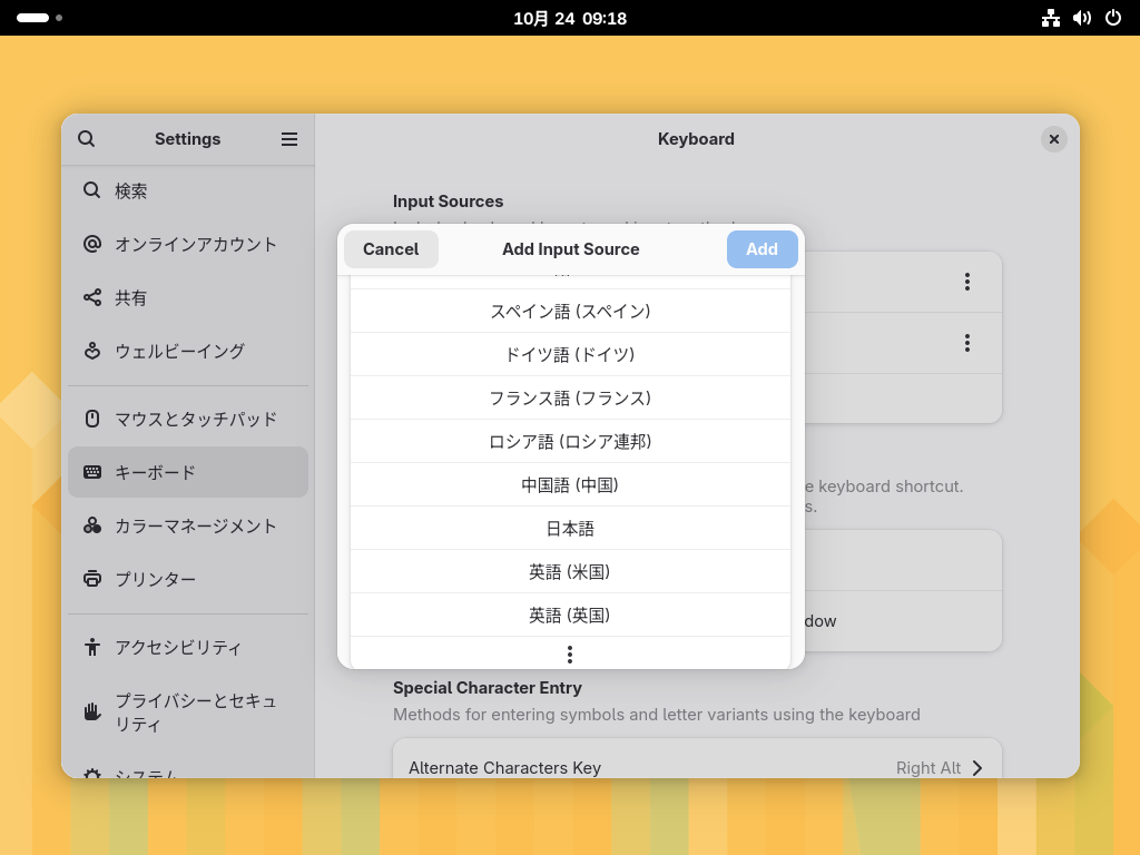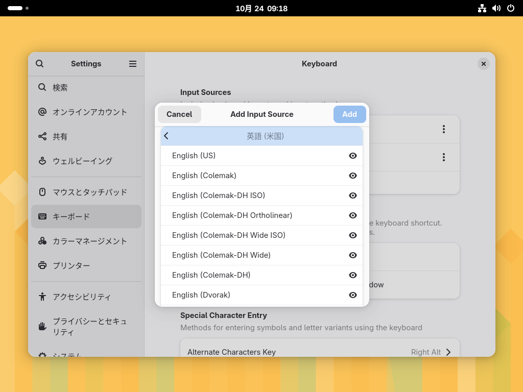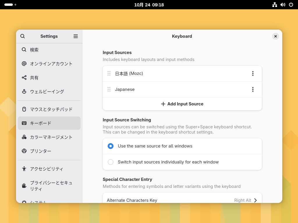 | [10] | [日本語 (Mozc)] を選択して [追加] ボタンをクリックします。 日本語がすでに追加されていた場合は、適当に英語を選択して追加します。 入力ソースの設定は以上です。設定画面の右上の [x] ボタンをクリックしてウインドウを閉じます。 |