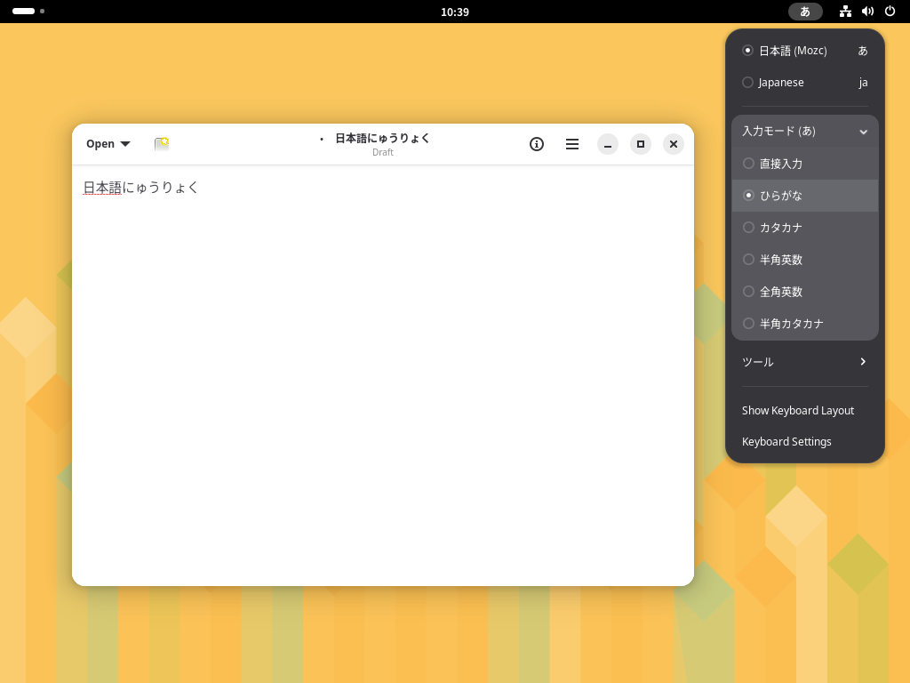 | [11] | 入力ソースが 2 つ以上登録されると、上段のパネルに入力ソースの切り替えアイコンが表示されるようになるので、 日本語を入力する場合は、アイコンをクリックした後、[日本語 (Mozc)] を選択すると日本語入力が可能となります。 |