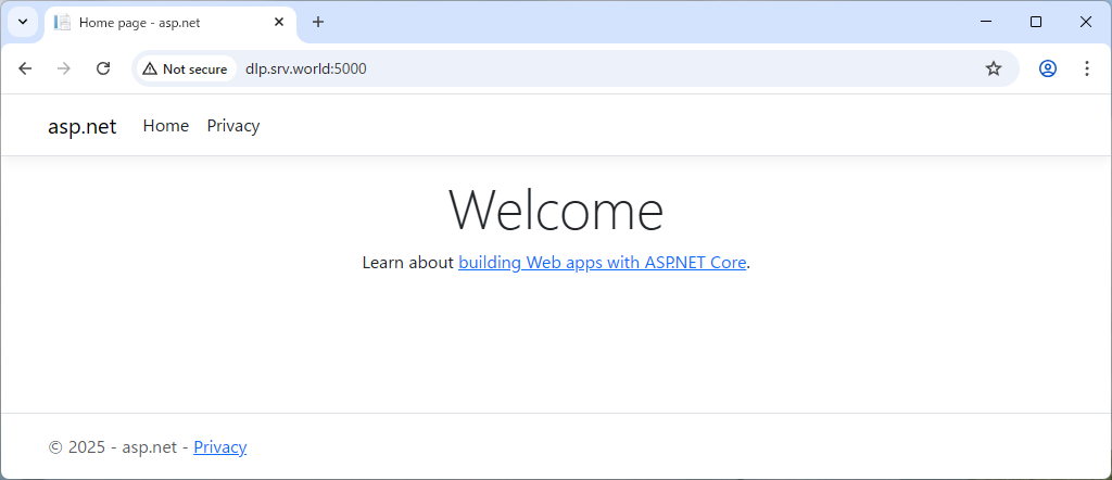 suse@dlp:~> dotnet new razor -o asp.net Welcome to .NET 9.0! --------------------- SDK Version: 9.0.308 Telemetry --------- The .NET tools collect usage data in order to help us improve your experience. It is collected by Microsoft and shared with the community. You can opt-out of telemetry by setting the DOTNET_CLI_TELEMETRY_OPTOUT environment variable to '1' or 'true' using your favorite shell. Read more about .NET CLI Tools telemetry: https://aka.ms/dotnet-cli-telemetry ---------------- Installed an ASP.NET Core HTTPS development certificate. To trust the certificate, run 'dotnet dev-certs https --trust' Learn about HTTPS: https://aka.ms/dotnet-https ---------------- Write your first app: https://aka.ms/dotnet-hello-world Find out what's new: https://aka.ms/dotnet-whats-new Explore documentation: https://aka.ms/dotnet-docs Report issues and find source on GitHub: https://github.com/dotnet/core Use 'dotnet --help' to see available commands or visit: https://aka.ms/dotnet-cli -------------------------------------------------------------------------------------- An issue was encountered verifying workloads. For more information, run "dotnet workload update". The template "ASP.NET Core Web App (Razor Pages)" was created successfully. This template contains technologies from parties other than Microsoft, see https://aka.ms/aspnetcore/9.0-third-party-notices for details. Processing post-creation actions... Restoring /home/suse/asp.net/asp.net.csproj: Restore succeeded.suse@dlp:~> cd asp.net suse@dlp:~/asp.net> dotnet run --urls=http://0.0.0.0:5000/