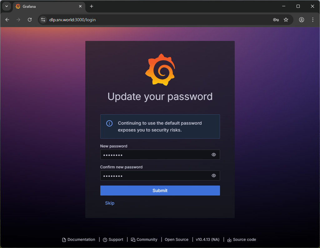 | [4] | 初回ログイン時は、デフォルトパスワードの変更を求められます。変更したい任意のパスワードを入力して [Submit] ボタンをクリックします。 |