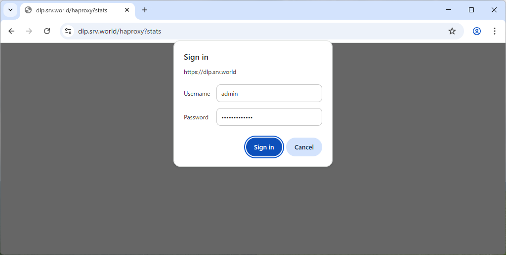 | [2] | 任意のクライアントコンピューターから HAProxy フロントエンドサーバーの、設定ファイルで指定した参照ページへアクセスすると、 以下のように認証を求められるので、設定したユーザーで認証します。 |