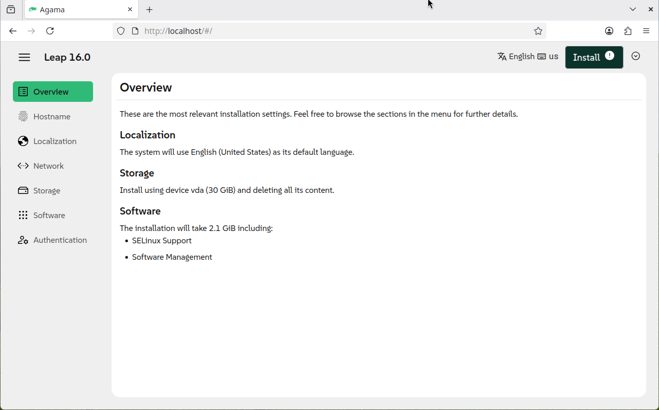 [10] | 左メニューの項目から必要な設定を実行後、右上の [Install] ボタンをクリックすると、インストールが開始します。 |