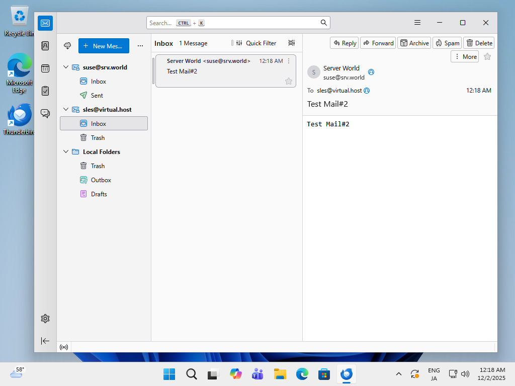 | [4] | 以上で設定完了です。 登録した仮想メールアカウントで、メールの送受信を実施して動作確認しておくとよいでしょう。 当例に従って設定した場合、メールクライアントに設定するユーザー名はメールアドレスとなります。 |