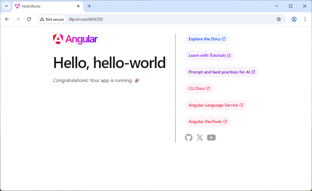 suse@dlp:~> ng new hello-world ..... ..... CREATE hello-world/src/app/app.routes.ts (77 bytes) CREATE hello-world/public/favicon.ico (15086 bytes) ✓ Packages installed successfully.suse@dlp:~> cd hello-world suse@dlp:~/hello-world> ng serve --host dlp.srv.world --port 4200