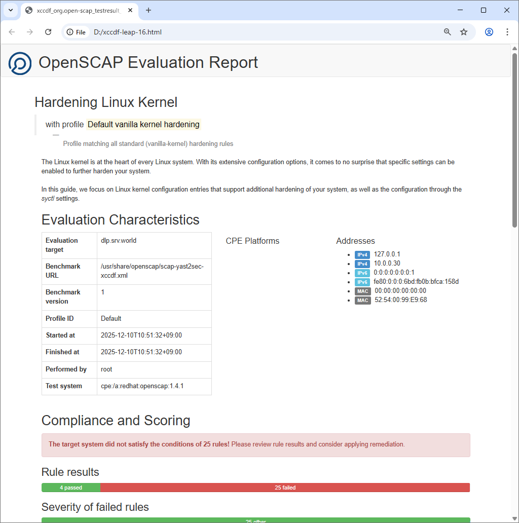 # ⇒ 指定可能なモジュール : info, xccdf, oval, ds, cpe, cvss, cve, cvrf # [--profile] : プロファイルを指定 # ⇒ 指定可能なプロファイルは [2] で確認した [Profiles] リスト # [--report] : HTML レポートの出力先 oscap xccdf eval \ --profile Default \ --report xccdf-leap-16.html \ /usr/share/openscap/scap-yast2sec-xccdf.xml --- Starting Evaluation --- Title sysctl net.ipv4.ip_forward must be 0 Rule rule-sysctl-ipv4-forward Result pass Title sysctl net.ipv4.tcp_syncookies must be 1 Rule rule-sysctl-ipv4-tcpsyncookies Result pass Title sysctl net.ipv6.conf.all.forwarding must be 0 Rule rule-sysctl-ipv6-all-forward Result pass Title sysctl net.ipv6.conf.default.forwarding must be 0 Rule rule-sysctl-ipv6-default-forward Result pass Title kernel config CONFIG_SYN_COOKIES must be y Rule rule-kernel-syncookies Result fail Title file /etc/login.defs must have a line that matches ^PASS_MAX_DAYS.*99999 Rule rule-pwd-maxdays Result fail ..... ..... |