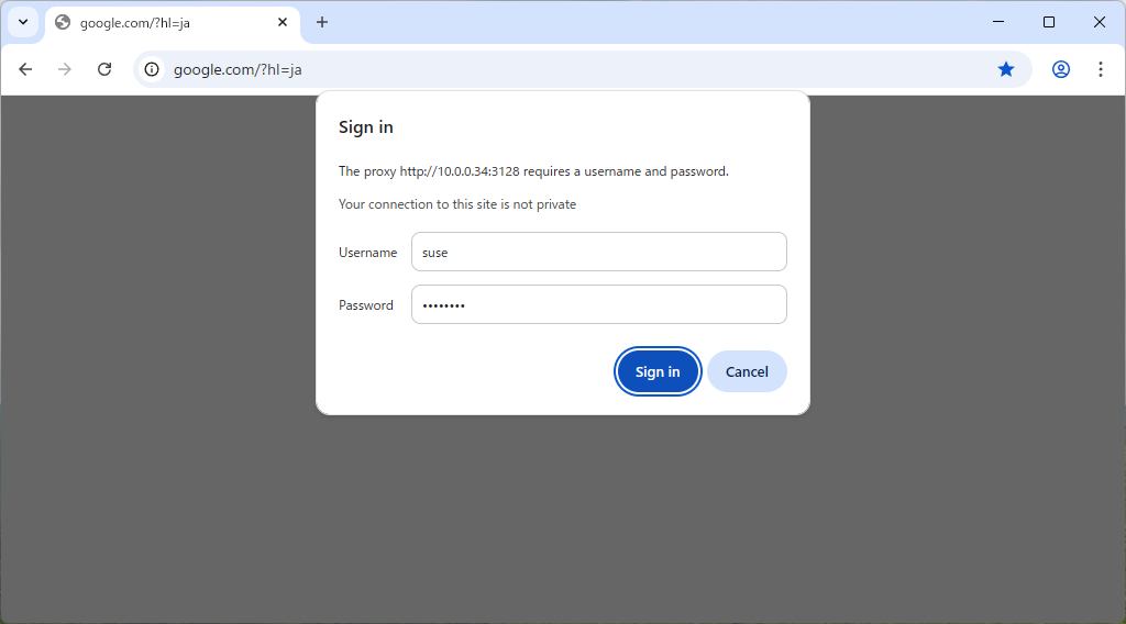 | [4] | Windows クライアントの場合、通常のプロキシの設定をした状態で Web アクセスすると、設定した Basic 認証にしたがって、以下のように認証を求められるので、認証すると通常通り Web アクセスできます。 |