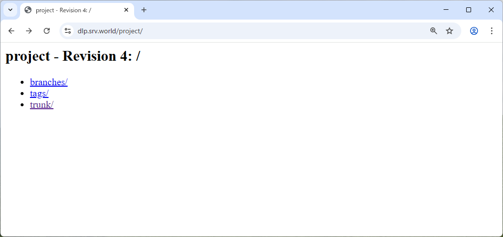 svn --username suse co https://dlp.srv.world/project Authentication realm: <https://dlp.srv.world:443> DAV SVN Password for 'suse': ******** A project/branches A project/tags A project/trunk Checked out revision 3.